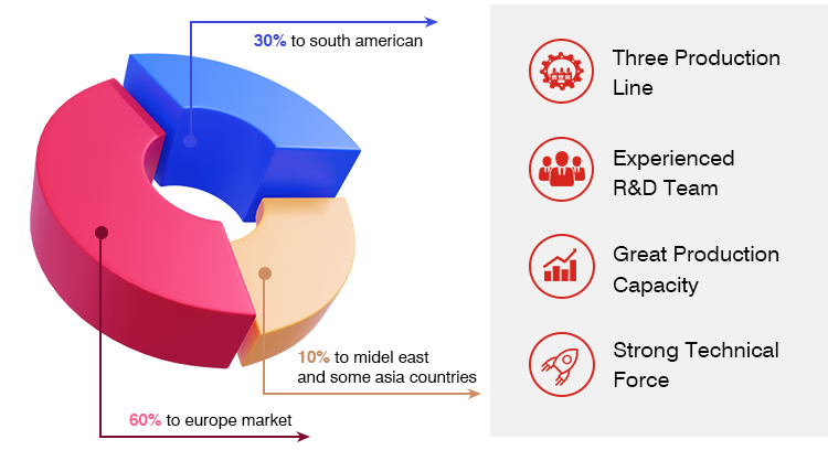 Our products mainly: 60% to European market, 30% to South America, 10% to Middle East and some Asian countries.