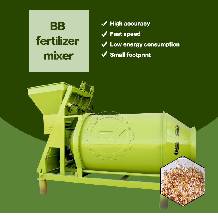 The full name of BB fertilizer is bulk fertilizer. It is a compound granular fertilizer mixer that mixes various single fertilizers or compound fertilizers in a certain proportion. With uniform particles, less water, particles