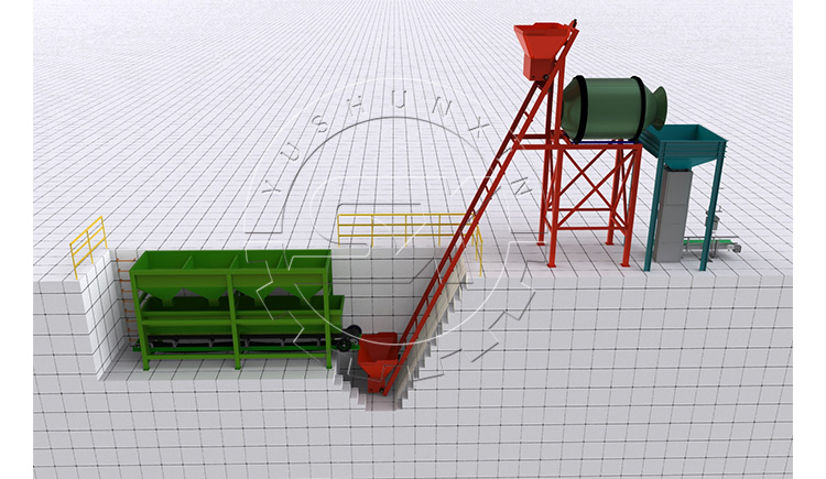 Computer PLC control system-->Automatic proportioning of raw materials-->Slope scraper lifting-->Drum mixing-->Mixed material enters the storage bin of the weighing machine-->Quantitative packaging (10-50kg/bag)--> Conveying and sewing –> Finished pellets are put into storage.