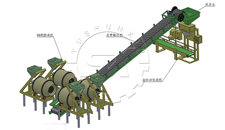 Introduction of intermittent BB fertilizer production lineThis batch type BB fertilizer production line is used for efficient production of bulk mixed fertilizer. It is designed according to different soil components in different regions and the specific requirements of compound fertilizer plants and fertilizer manufacturers.