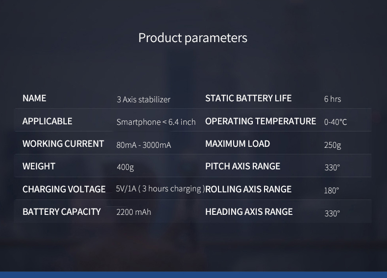 | Battery Life: | 6 hours | Key words: | handheld gimbal |