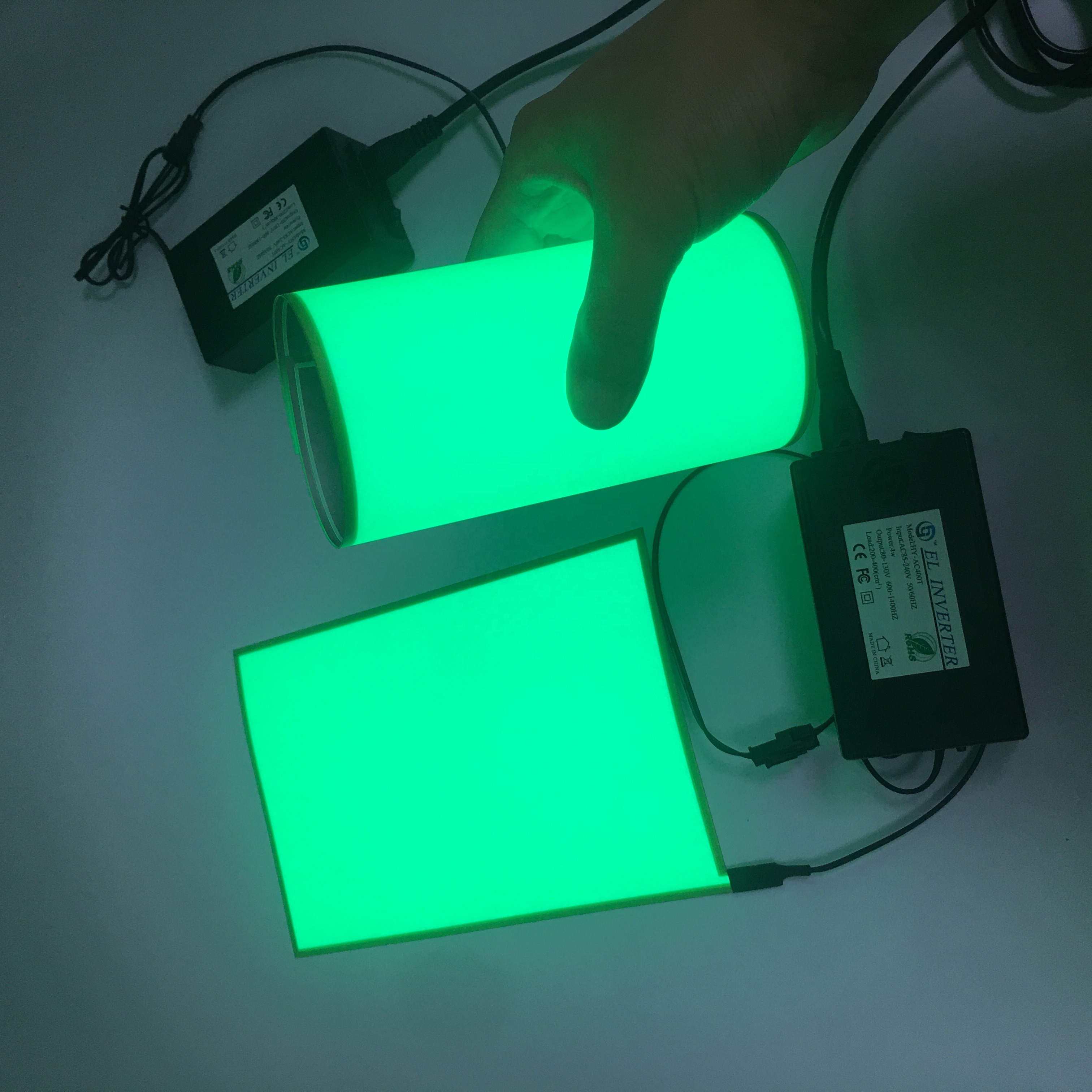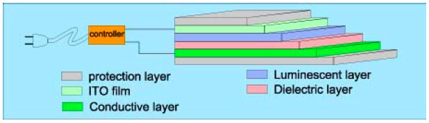 Electroluminescence occurs when you insert a sandwich made of plastic, conductive material, and phosphor. Basically, you have two electrode layers in a sandwich with a layer of phosphor in between. Phosphors emit light when electrical current is passed from one electrode layer to the other.