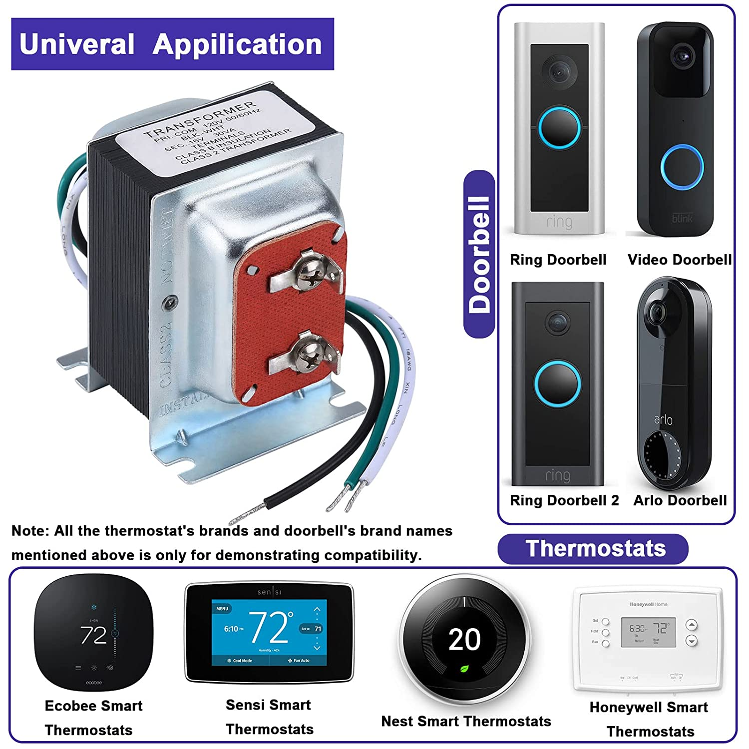 Universal Compatibility | This 24v transformer is compatible with Ring video doorbell, Ring video doorbell 2, Ring video doorbell pro, Nest Skybell Doorbell, also compatible with Nest, Ecobee, Honeywell, and Sensi smart thermostats, and other devices that need to run 24/7 volt power operation. |