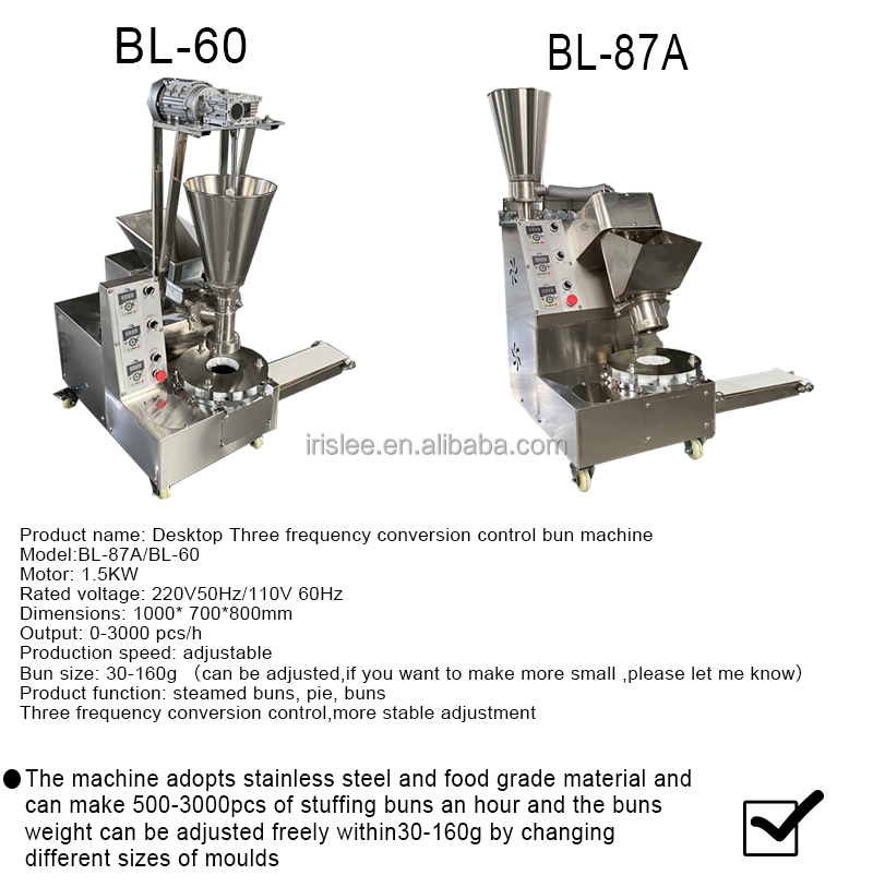 Model: BL-87A/BL-60 Motor: 1.5KW Rated Voltage: 220V50Hz/110V 60Hz Size: 1000*700*800mm Output: 0-3000pcs/hour Production Speed: Adjustable Bun Size: 30-160g (Can be adjusted, let me know if you want to make it smaller) Product function: buns, pies, buns three frequency conversion control, the adjustment is more stable