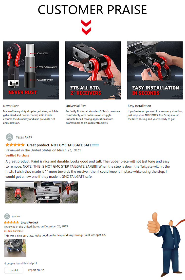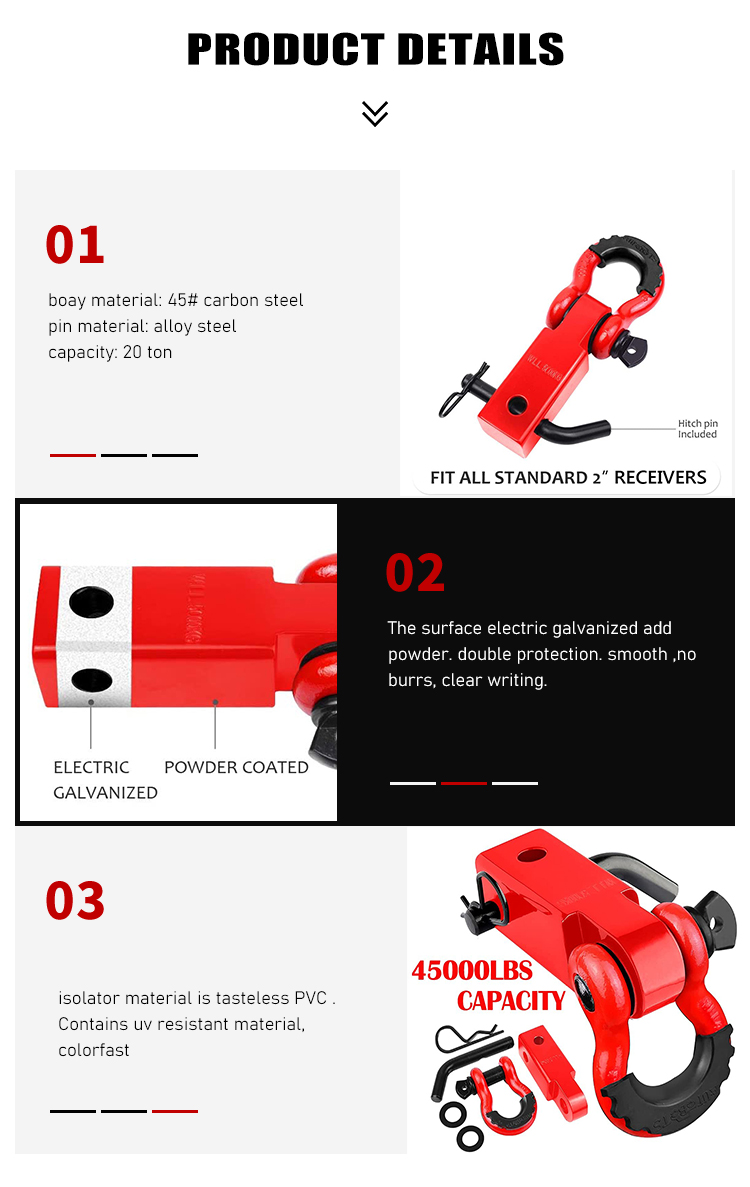 *hhigh strength: Our trailer hitch receivers are made of carbon steel and have a break point of 45,000 lbs. Shackle silicone spacers to prevent scratches during installation. This shackle hitch receiver accessory is suitable for all towing applications * Anti-rust: The hitch receiver is electro-galvanized steel for corrosion protection for added durability. Black powder coat provides durable and strong protection for the trailer hitch receiver against the harshest conditions
