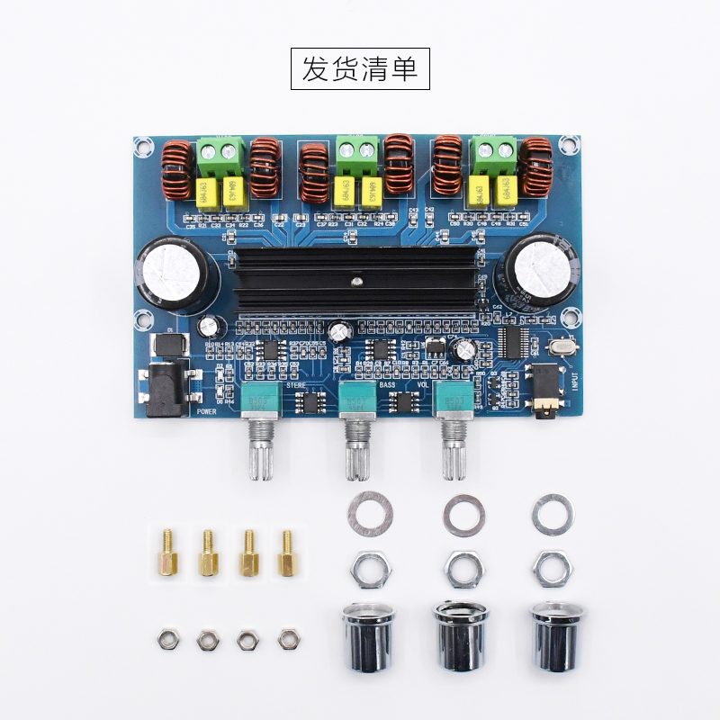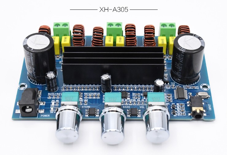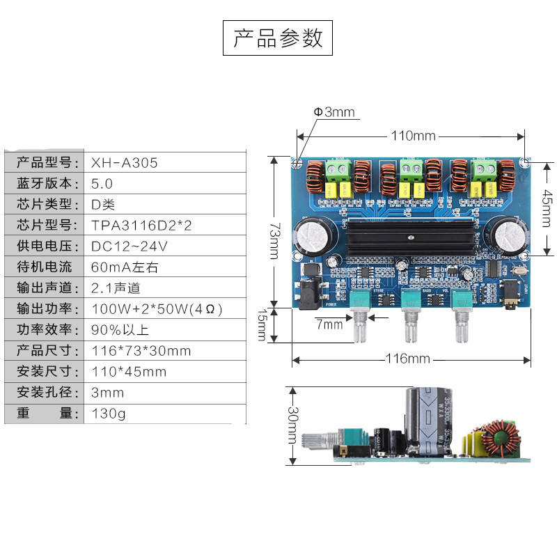 | The main parameters: Product name: BT digital power amplifier board Product model: XH-A305 Bluetooth version: 5.0 Chip Type: Class D Chip model: TPA3116D2*2 Power supply voltage: DC12-24V Standby current: about 60mA Output channel: 2.1 channel Output power: 100w+2*50wΩ(4) Power efficiency: more than 90% Product size: 116*73*30mm Installation size: 110*45mm Installation hole diameter: 3mm Weight: 130 grams |