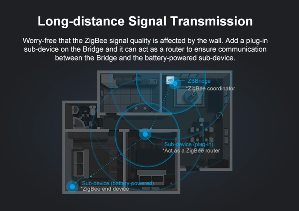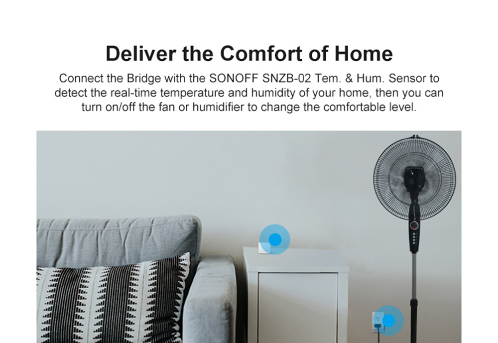 SONOFF ZigBee Bridge is the heart of smart home, which allows you to remotely manage various ZigBee devices and sensors, realize monitoring and control of the home, and allows you to create smart scenes, allowing Wi-Fi and ZigBee smart devices to communicate to access a smarter home, And use the eWeLink APP to control them. It maximizes the efficiency of up to 32 connected sub-devices, which are ZigBee-based switches, plugs and safety sensors. Sensors such as SONOFF BASICZBR3 Wi-Fi smart switch, S31 zb Lite smart plug, SONOFF SNZB-01 wireless switch and SNZB-02 temperature and humidity sensor, SNZB-03 motion sensor and SNZB-04 wireless door and window sensor can be connected to the Bridge to provide you with the creation Possibility of various scene linking. In terms of more supported devices, Bridge can also be paired with ZigBee Alliance-certified one-unit smart switches, temperature and humidity sensors, motion sensors, wireless door and window sensors, and water sensors. One-click pairing of all sub-devices, faster than Wi-Fi pairing. Supports adding cameras on bridges or sub-devices, making it easy to view your home on either. You can also command Alexa or Google Home to voice control your home.
