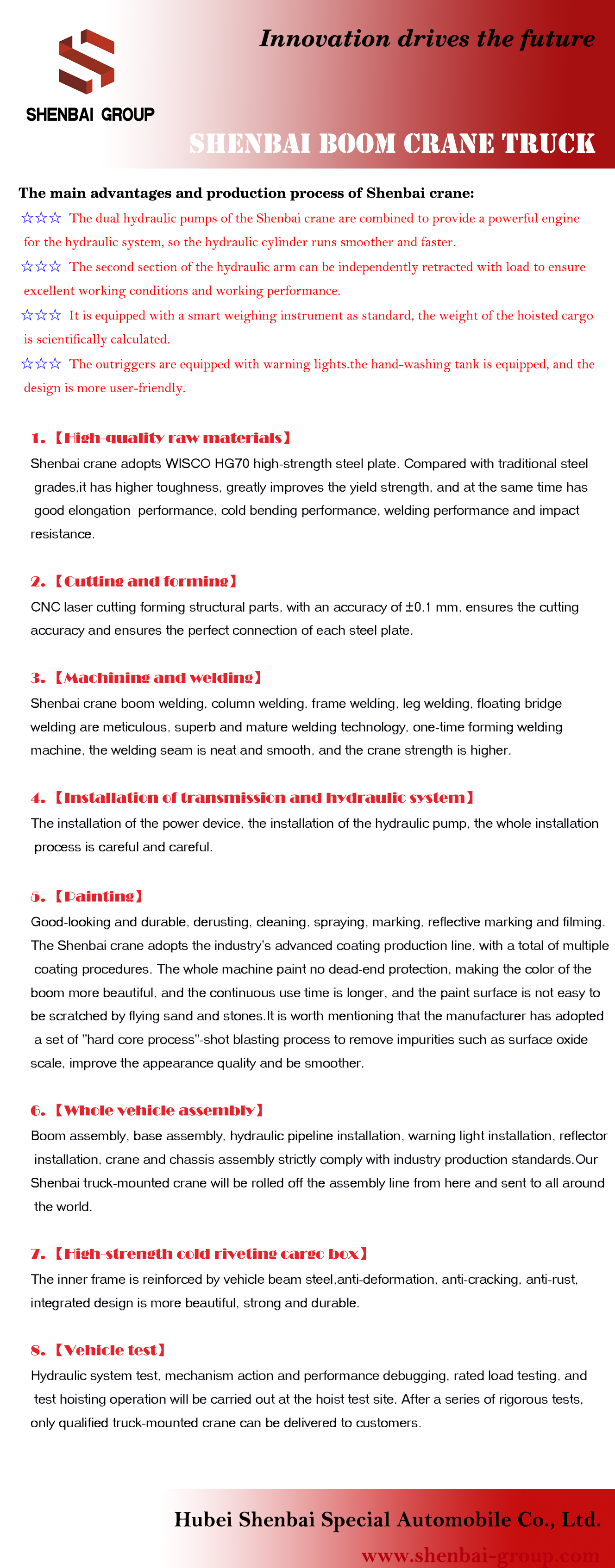 1. Single-cylinder synchronous cable technology, the work efficiency is higher than before. 2. Advanced development methods ensure the reliability of the design. 3. The more symmetrical center design of the pentagonal hexagonal arm makes it have greater bending resistance. 4. Compact hinge point design takes up less space. 5. It is safer to work after installing the wind alarm device. 6. The overall hoisting winch greatly improves the working efficiency and prolongs the service life of the hydraulic system. 7. The floating three-point bridge structure reduces the additional stress on the chassis during driving. 8. The slewing mechanism designed and developed by itself has a greater driving force and can meet the requirements of various working conditions. 9. The anti-swing impulse device that makes the vehicle safe..