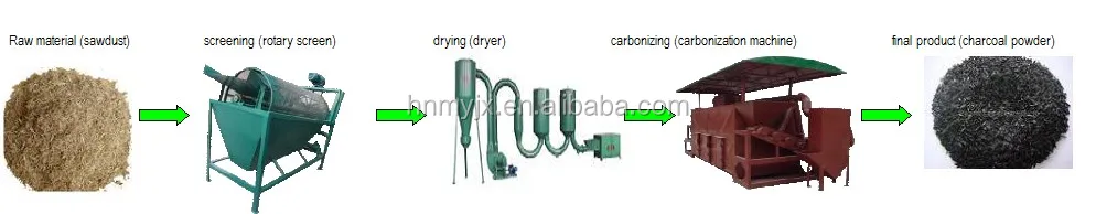 The product line of the Coconut Shells rice husk carbonization machine is: primary screening sawdust of different sizes to eliminate bigger impurity, then drying the materials to be 8-12% water content, and make carbonization in the end