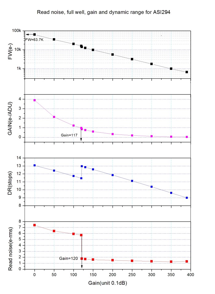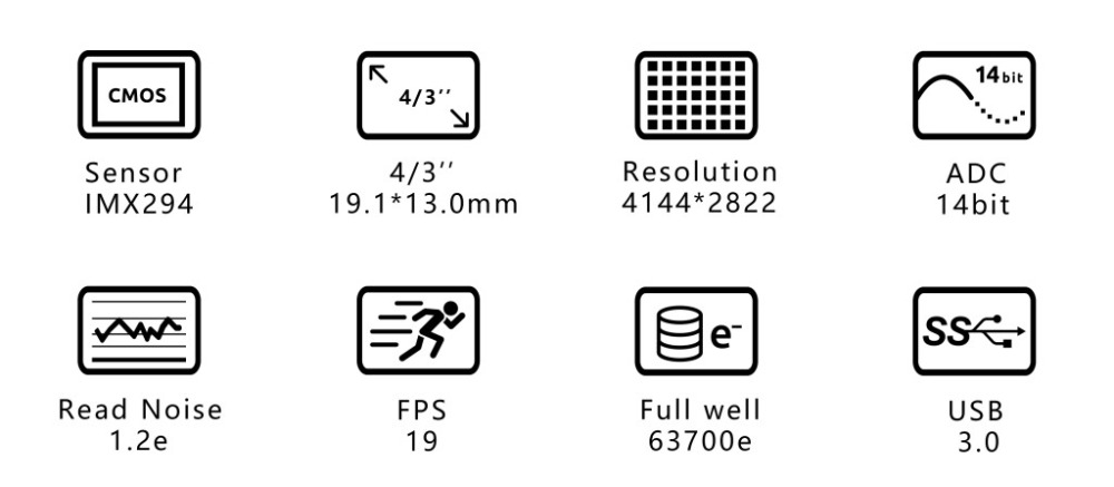"IMX294CJK" is the first image sensor for astronomical cameras in China that adopts the Type 4/3 format, and realizes the output of the number of pixels required for 4K at 120 frames per second (in ADC 10-bit output mode, ASI294MC is based on USB3. format can run up to 25fps). Furthermore, an SNR1 of 0.14 lx* can be achieved using large pixel sizes, which is very close to the value of ASI224 (0.13 lx*).