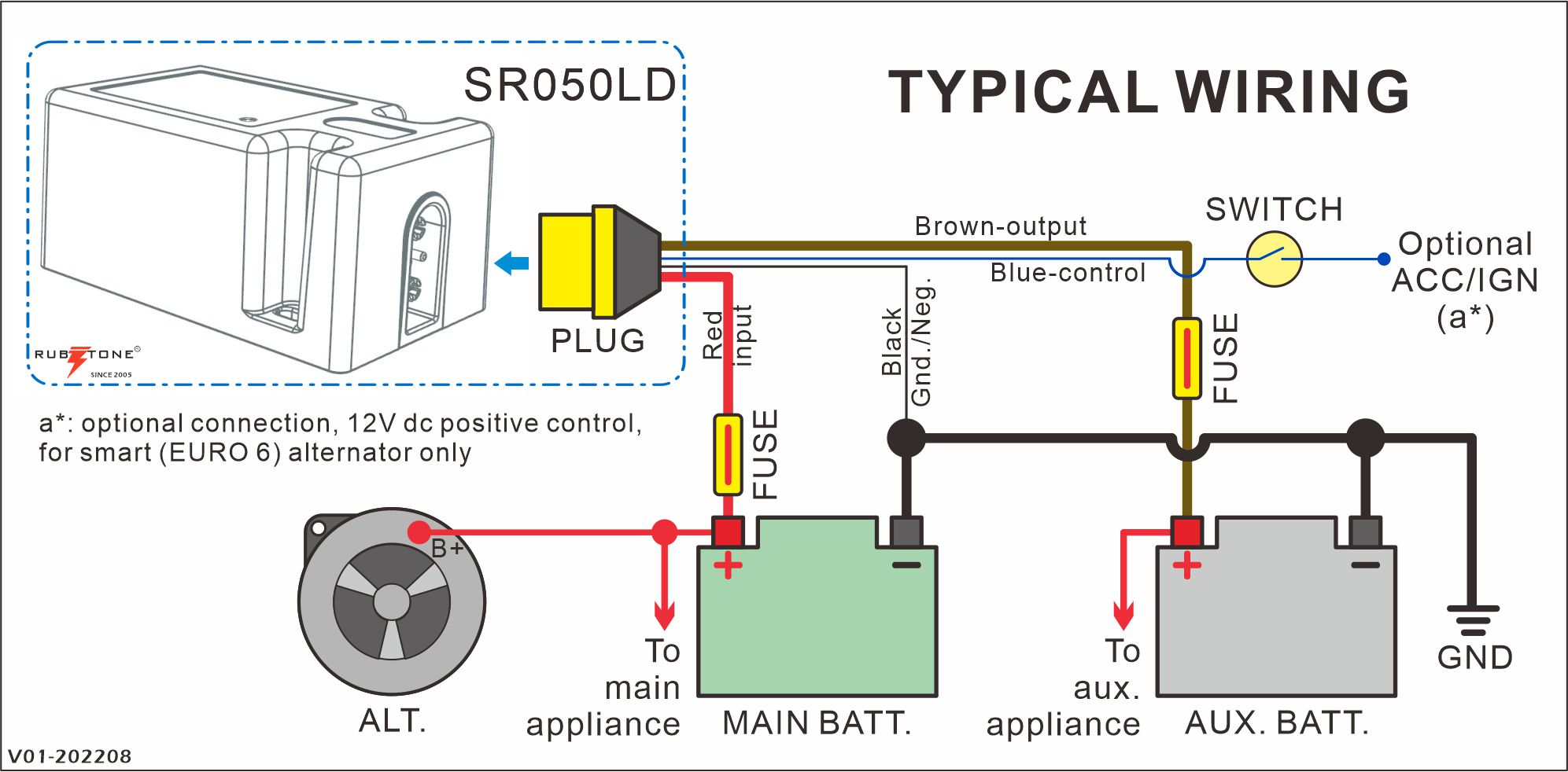 A voltage sensitive relay (VSR) allows two batteries to be charged simultaneously. When the engine is started, the main battery packs (boot and house) are charged simultaneously. When the combined voltage drops below 12.8 volts (eg. engine stopped), the VSR disengages, separating the battery. The system eliminates the possibility of draining the wrong battery and protects sensitive electronics powered by household batteries from harmful engine start spikes.