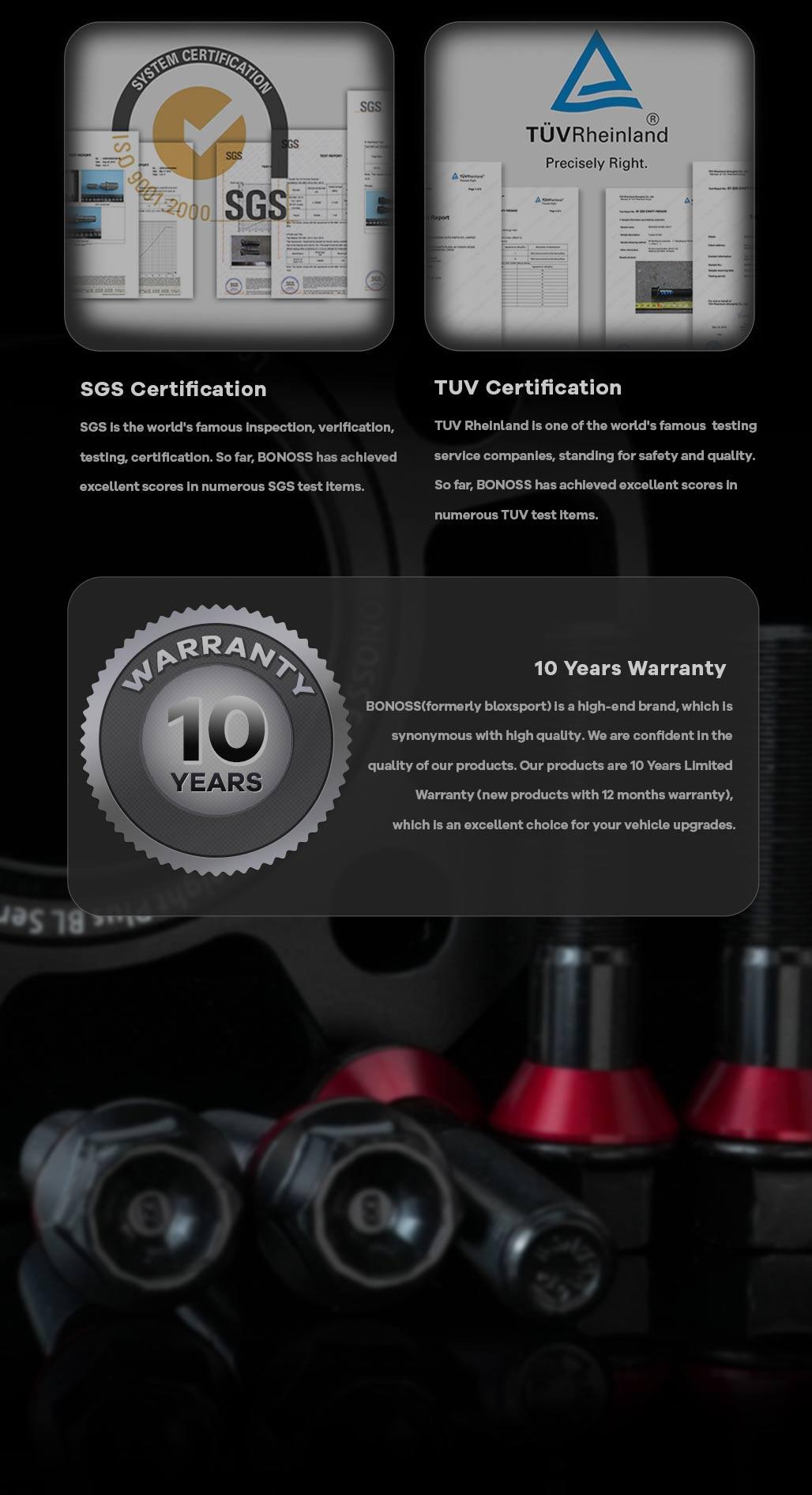 Guangzhou Zhongpeng Auto Parts Co., Ltd. was established in 2007. It is a company specializing in the research and development, production and sales of forged wheel spacers, bolts and nuts. Since the establishment of the company, we have adhered to the principle of safety first and strict self-discipline. We believe that every wheel spacer, bolt or nut carries the integrity and happiness of a family. Therefore, we insist on strictly following ISO high standards from raw material selection to finished product testing, and introduce independent testing from third-party authoritative organizations such as SGS and TUV to ensure that every product can carry the safety mission. Since the establishment of the company in 2007, we are mainly engaged in OEM or ODM of high-strength wheel spacers, bolts/studs and nuts, providing high-quality, professional and personalized products and services to customers from more than 100 countries including Germany, Japan , United States, United Kingdom, Italy and Sweden. Now, our products are sold to more countries and regions around the world. In 2014, we launched wheel nuts and wheel spacers based on our own brand "BLOXSPORT". Subsequently, BLOXSPORT has rapidly grown into the preferred brand of many car enthusiasts and games with its high-quality products, professional service level and super high cost performance. Let us obtain the power source of continuous improvement from the overwhelming positive