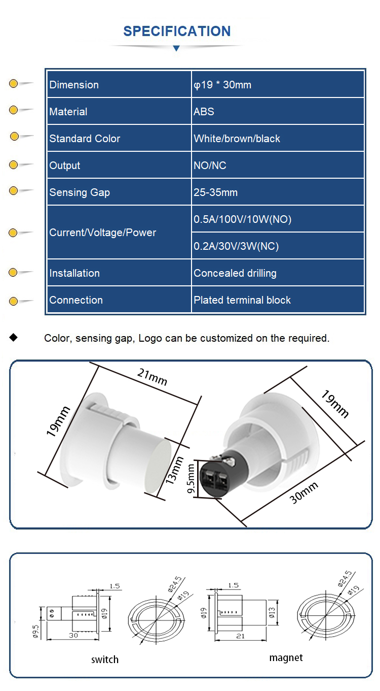 | aspect: | Diameter 19*30mm | application: | Door and window/security alarm system |