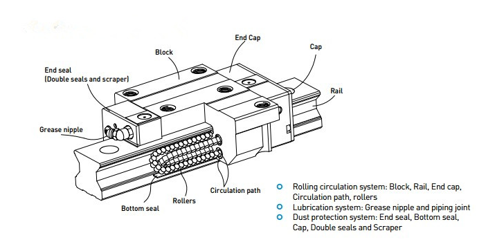 High rigidity linear motion rolling guide evenly supports high load capacity with built-in large diameter balls.