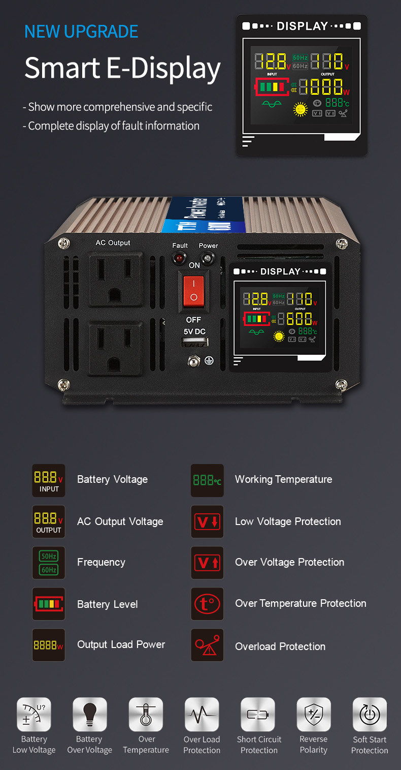 4. The sine wave inverter adopts LCD liquid crystal display mode, and the status is clear at a glance.