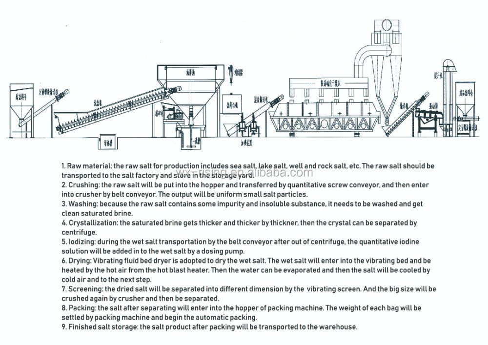 Coarse salt is sent to the spiral salt washing machine for the first washing, and then crushed by a roller crusher to obtain salt with a suitable particle size. The salt is washed two or three times in agitator washers and countercurrent washers to obtain purified salt. The next step is to go into a centrifuge to remove most of the water. The salt is then dried in a vibrating fluidized bed to obtain finished salt with a water content of 0.4%. During the process of transporting the salt from the centrifuge to the vibrating fluidized drying bed, there will be an iodine adding machine to add iodine to the salt. The last step is to pack the finished salt.