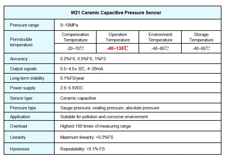 The W21 series pressure sensor core is a dry ceramic capacitive pressure sensor made of ceramic materials and a special method. Ceramics are recognized as highly elastic, corrosion-resistant, wear-resistant, impact- and vibration-resistant materials. The thermal stability of ceramics makes it possible to operate in a temperature range of -40 to 135°C, and has high-precision measurement and high stability. Its anti-overload capacity can reach 100 times of the range, which completely solves the shortcoming of other types of sensors with poor overload capacity in small ranges. In addition to the general sensor range, the most distinctive feature is its positive and negative gauge pressure functions, such as: ±10kPa, ±1MPa etc. The ceramic capacitive pressure sensor has high output and wide range, and is especially suitable for manufacturing high-performance industrial control pressure transmitters and adapting to pressure measurement in harsh environments.