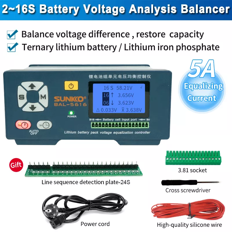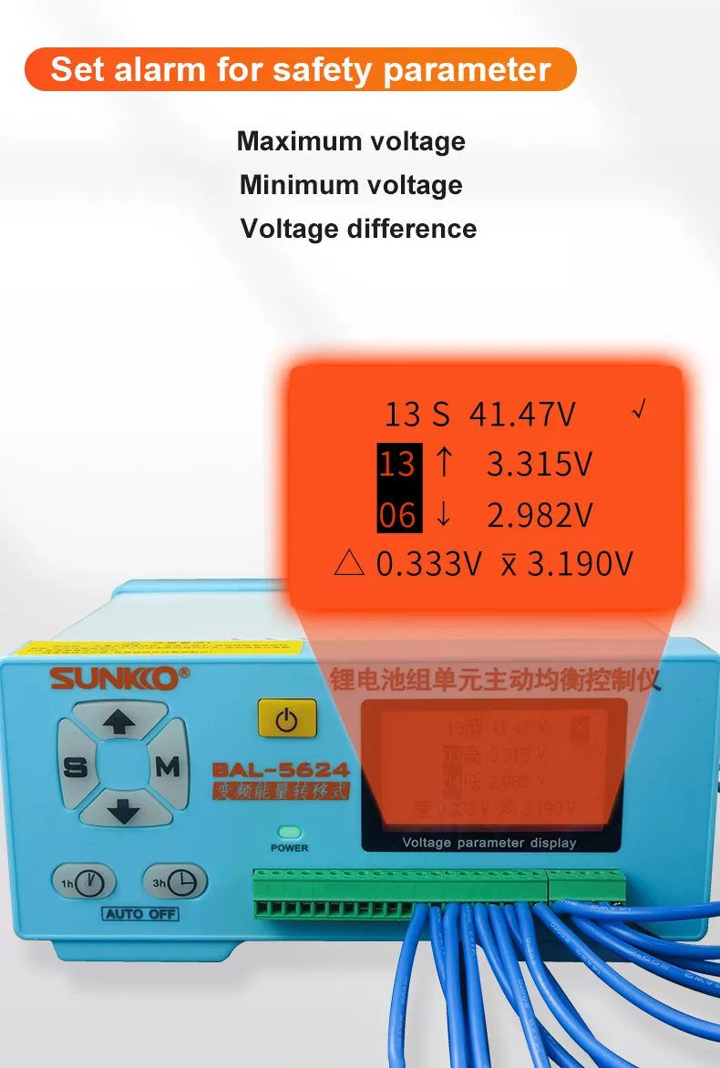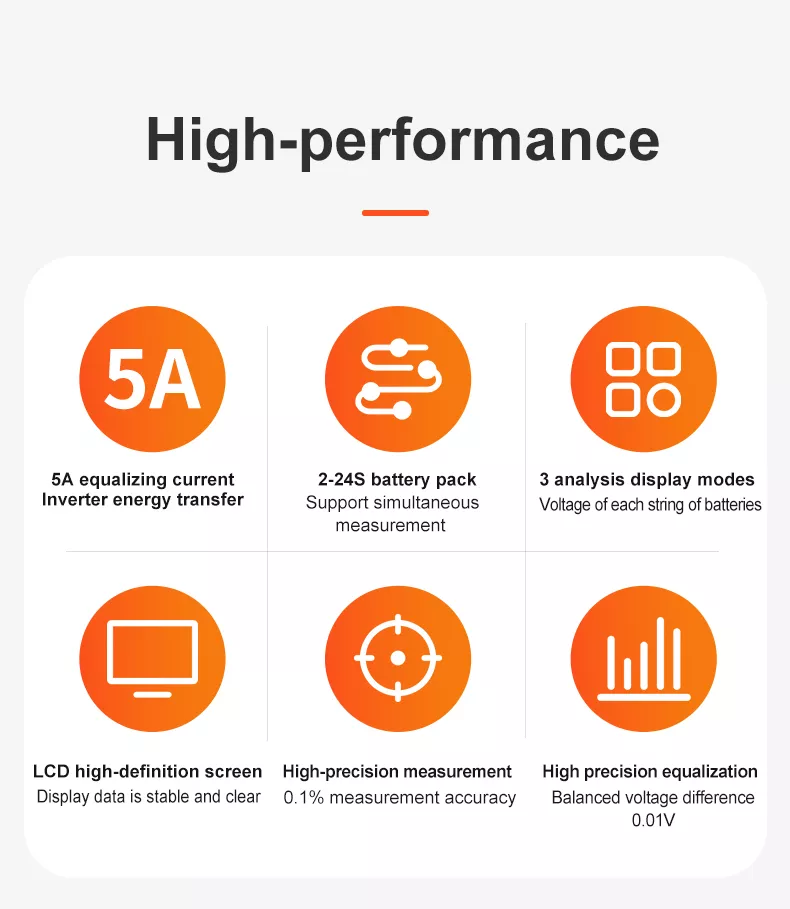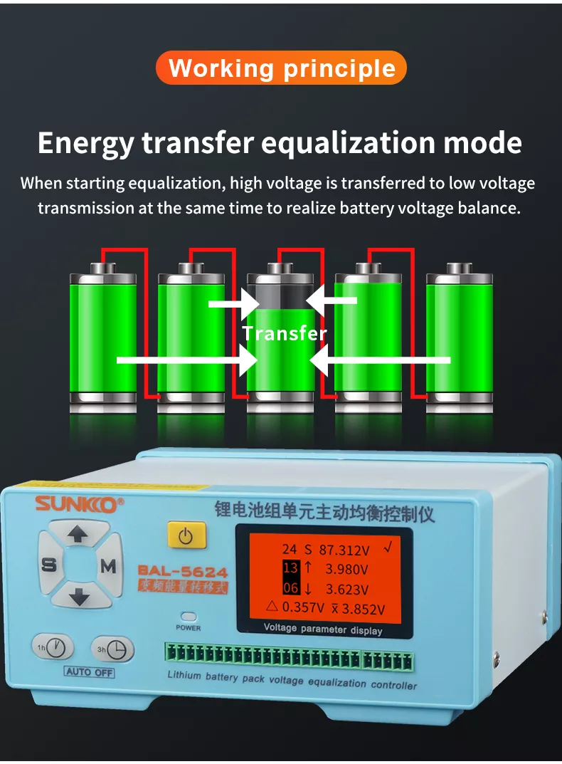 In the parallel state, the high and low voltage batteries of each string realize energy transmission and distribution, and finally realize the efficient and accurate balance of the battery pack. Taiwan's main control chip MCU combined with an ultra-low dynamic impedance inverter to obtain a balanced current greater than 8A. Precise transformer technology and fully symmetrical circuit design can achieve a balance effect of ≤30mV. And the analyzer adopts the latest large-scale high-speed MCU chip of American Microchip Company to conduct real-time and accurate detection of each lithium battery pack. The voltage information collected by the chip is stored, calculated and compared, and the data is processed and displayed on the LCD screen. The detector can sense the voltage of up to 24 lithium cells in series