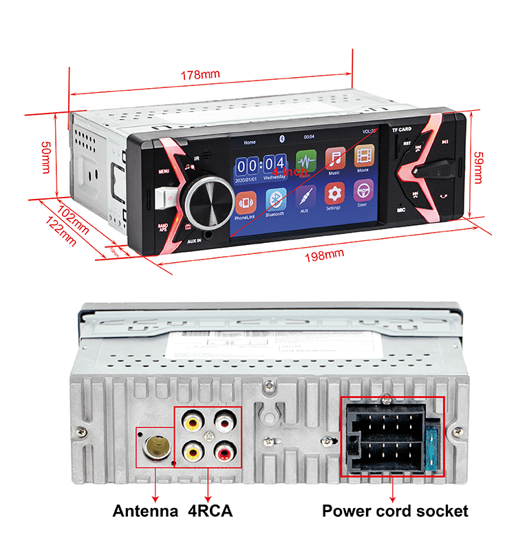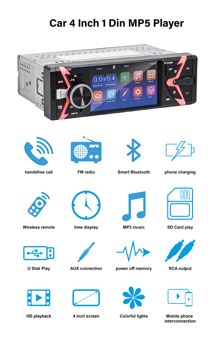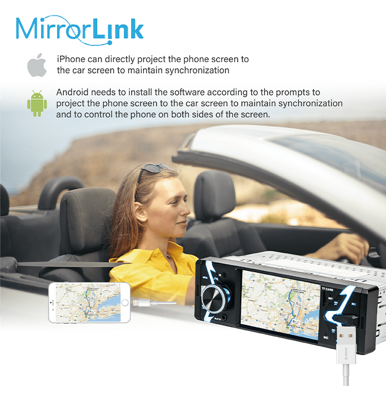 * 4'' Single Din MP5 Player * USB port and SD card slot * Support HD 720p, video playback * FM radio * Bluetooth hands-free phone calls and music playback * Built-in high-quality microphone * Rear view camera connection input * Rear view camera input, automatically switch to rear view when reversing * Steering wheel control intelligent matching * Full function remote control * High power: 45W X 4CH * Multilingual OSD menu * ISO connector * 4 RCA (1 video output, 1 video input, audio output and input) * With video output * Built-in Android phone two-way Mirrorlink * Built-in one-way iPhone link |