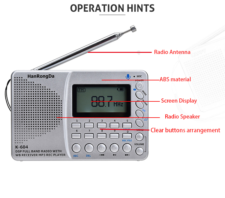 | band: | 3 bands (FM/AM/SW) | radio: | FM: 70-108MHZ MW (10K): 520-1710KHZ WB: 162.400-162.550MHZ |