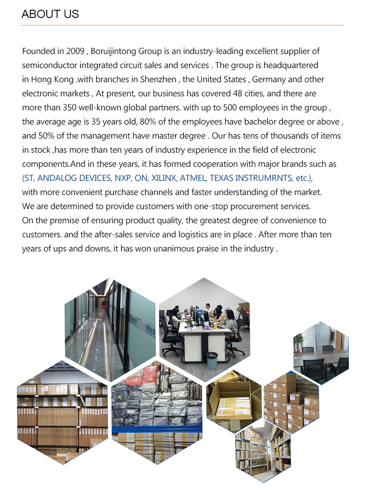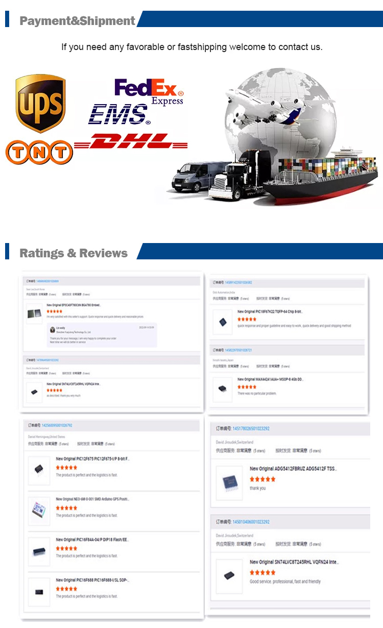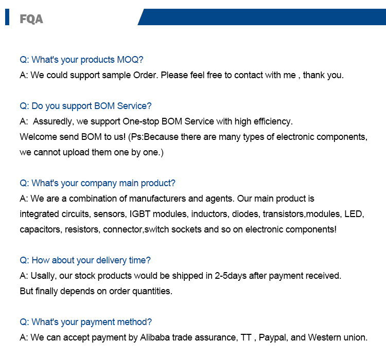 Q: What is the MOQ of your products?A: We can support sample order. Please feel free to contact me, thanks.Q: Do you support BOM service?A: Of course, we support efficient one-stop BOM service. Welcome to send BOM to us! (ps: Because there are many types of electronic components, it is impossible to upload them one by one.)Q: What is the main product of your company?A: We are a combination of manufacturer and agent. The main products are integrated circuits, sensors, IGBT modules, inductors, diodes, transistors, modules, LEDs, capacitors, resistors, connectors, switch sockets and other electronic components!Q: How about your delivery time?A: Usually, our stock products will be shipped within 2-5 days after payment received. But it depends on the order quantity in the end.Q: What is your payment method?A: We can accept the payment by Alibaba Trade Assurance, TT, Paypal and Western Union.