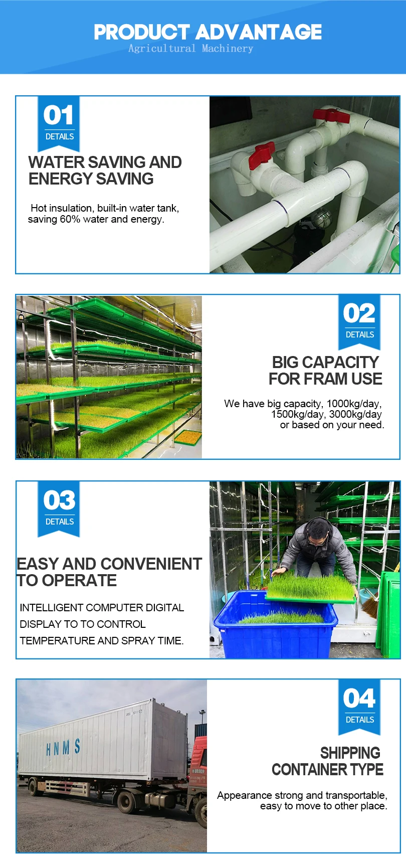 | Packaging Detail: | The machine is a 40ft container; | Type: | Hydroponic Fodder; |