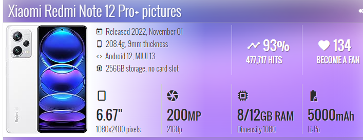 | model: | Xiaomi Redmi Note 12 Pro+ | fast charging: | 60-69W |