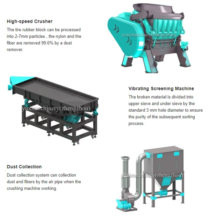 | Complete separation | The rubber Crumbs, Steel and Fibre can be separated automatically. Adopt PLC control system, it is only need 4-6 persons to operate a Tire recycling(granule)production line with 3000kg/h capacity. Low energy consumption. The installed powder of Tire recycling production(granule)line with capacity 3000kg/h is about 800kw. |