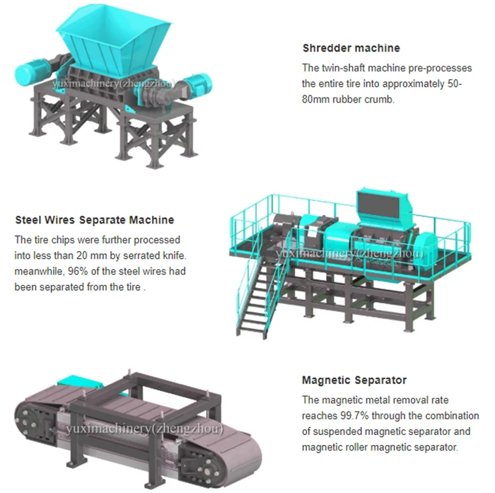 Our tire recycling machines can break down the waste tires into rubber granules, rubber powder, steel wire and fiber.