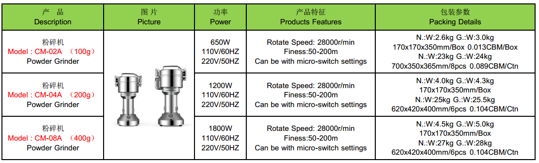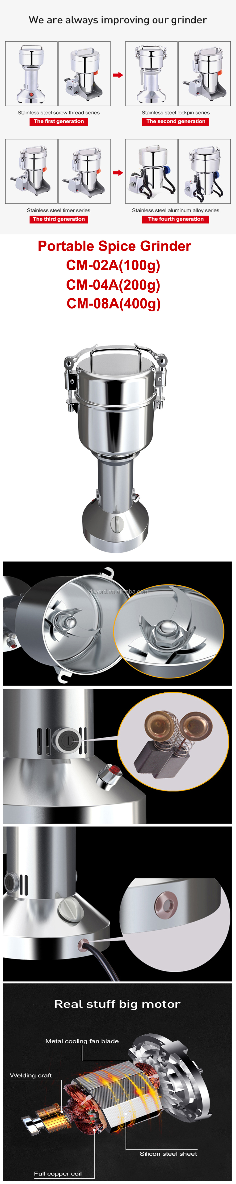 This mill is suitable for medicine spices vanilla salt rice coffee beans cocoa corn pepper soybean leaves;