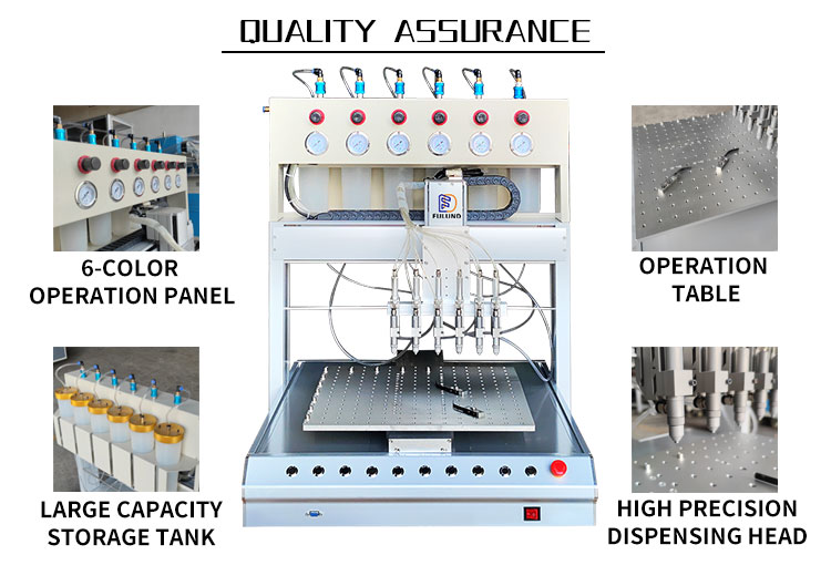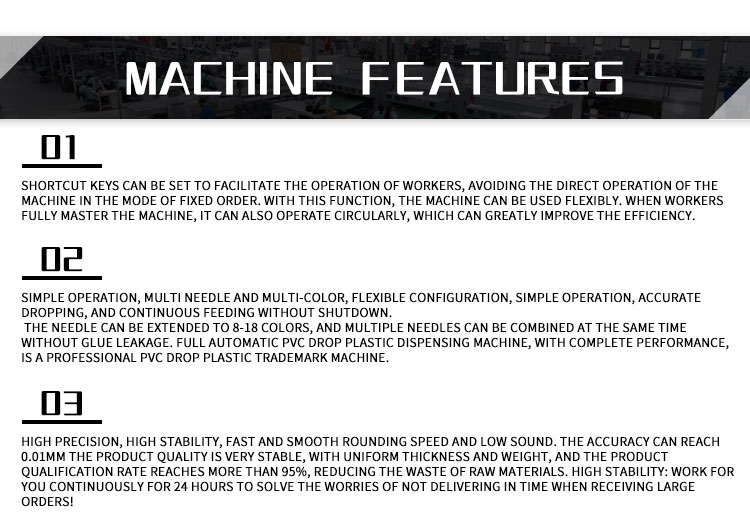 The needles can be expanded to 8-18 colors, and multiple needles can be combined at the same time without glue leakage. Fully automatic PVC drop plastic dispenser with complete performance, it is a professional PVC drop plastic label machine.