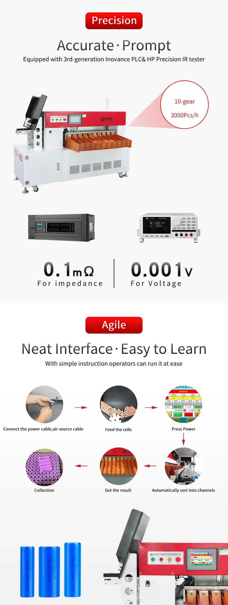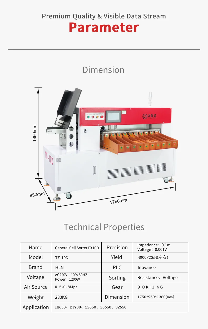 Item | 10 Channels Battery Sorting Machine | Model | HLN-18FX-10D | Operating Voltage | AC 220 V±10% 50 HZ | Power | ≤1000 W | Application Battery | 18650 | Receiving Channel | 10 Channels | Sorting Parameter | AC Internal Resistance+DC Voltage | Productivity | 4500 PCS/H | Sorting Accuracy | Internal Resistance: 0.1mΩ, Voltage: 0.001V | Pneumatic Compressure | 0.3-0.6 Mpa | Acutate Ratio | 99% | Weight | 250 KG | Dimension | 1945(L)*1968(W)*1600(H) mm | For OEM & Specifications, contact Martin at wechat/whatsapp +86 18685360482 |