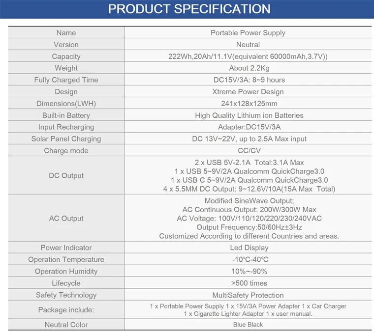 | DC output | 4 x DC Output 9~12V/10A/15A Max 2 x USB 5V-2.1A Total:3.1A Max 1 x USB 5~9V/2A Qualcomm QuickCharge3.0 1 x USB C 5~9V/2A Qualcomm QuickCharge3.0 | |