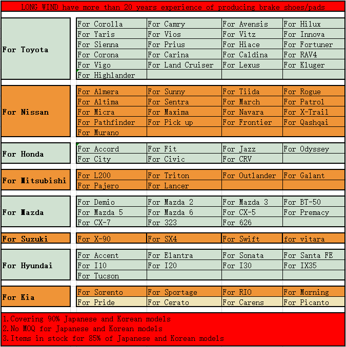 | Model: | INNOVA I (_N4_), PASSO, COROLLA, MAVERICK, H100, Picnic, CX-5, NOAH/VOXY, GETZ, SUNNY, MARCH, PICK UP (720), Juke, 5, FORTUNER, URVAN, toyoace, 3, FORTE, VIOS, NOAH, Prius, ISIS, X-90, RAV4, 4Runner, BT-50, Elantra, Tundra, PAJERO, Legacy, Frontier, Ist, 2, WAGON R, accent, CANTER, SIRION, Micra, CORONA, IMPREZA, Forester ,TRIBUTE,Spark,XTERRA,RIO,Camry,AVENSIS,H-1,JOICE,Sx4,626,323,Ignis,Soluna,FUSO,Ranger,Rodeo,Jazz,VITZ,FJ Cruiser,SENTRA,CARINA E,MAX,City,Explore Passenger,Land Cruiser,Almera,Coaster,SORENTO,VITARA,Civic,Jimny,ALTIMA,YARIS,CERATO,TERIOS,cami,Fit,CRV,Sonata,Premacy,TITAN,Santa Fe,Sienna,Versa,L400,L200,L300 ,D-MAX,TIIDA,TITAN,Accord,BELTA,HIACE,STARLET,Note,SOLARIS I,Dyna,HILUX | Supply capacity: | 20000 pieces per month |