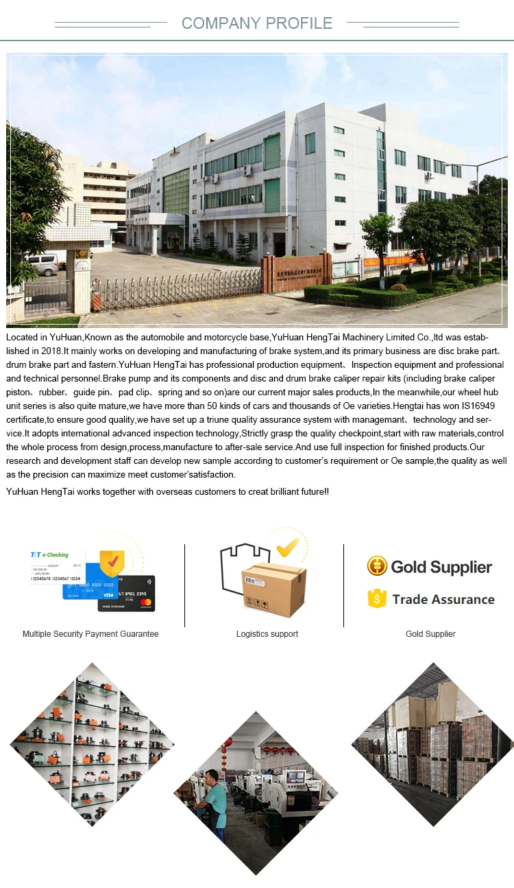Located in YuHuan,Known as the automobile and motorcycle base,YuHuan HengTai Machinery Limited Co.,ltd was established in 2018.It mainly works on developing and manufacturing of brake system,and its primary business are disc brake part,drum brake part and fastern.YuHuan HengTai has professional production equipment,Inspection equipment and professional and technical personnel.Brake pump and its components and disc and drum brake caliper repair kits (including brake caliper piston,rubber,guide pin,pad clip,spring and so on)are our current major sales products.Hengtai has won IS16949 certificate,to ensure good quality,we have set up a triune quality assurance system with managemant,technology and service.It adopts international advanced inspection technology,Strictly grasp the quality checkpoint,start with raw materials,control the whole process from design,process,manufacture to after-sale service.And use full inspection for finished products.Our research and development staff can develop new sample according to customer’s requirement or Oe sample,the quality as well as the precision can maximize meet customer’satisfaction.