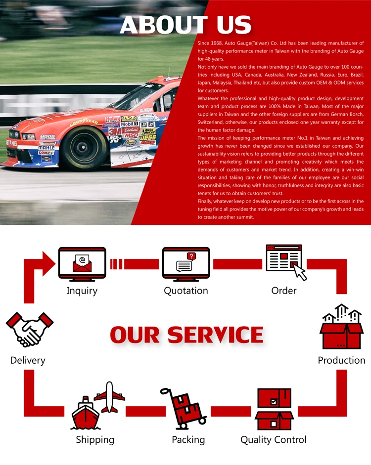 4. Auto Gauge's ultimate goal is to pursue the perfect design and keep stable quality not only to keep good brand image and high quality for customers but also take the responsibility for them.