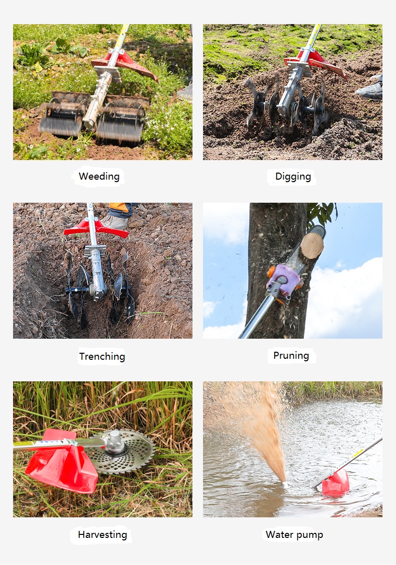1. Effective anti-vibration system 2. Engine cleaning intake system 3. Throttle/switch combination structure 4. Automatic feeding of different working heads |
