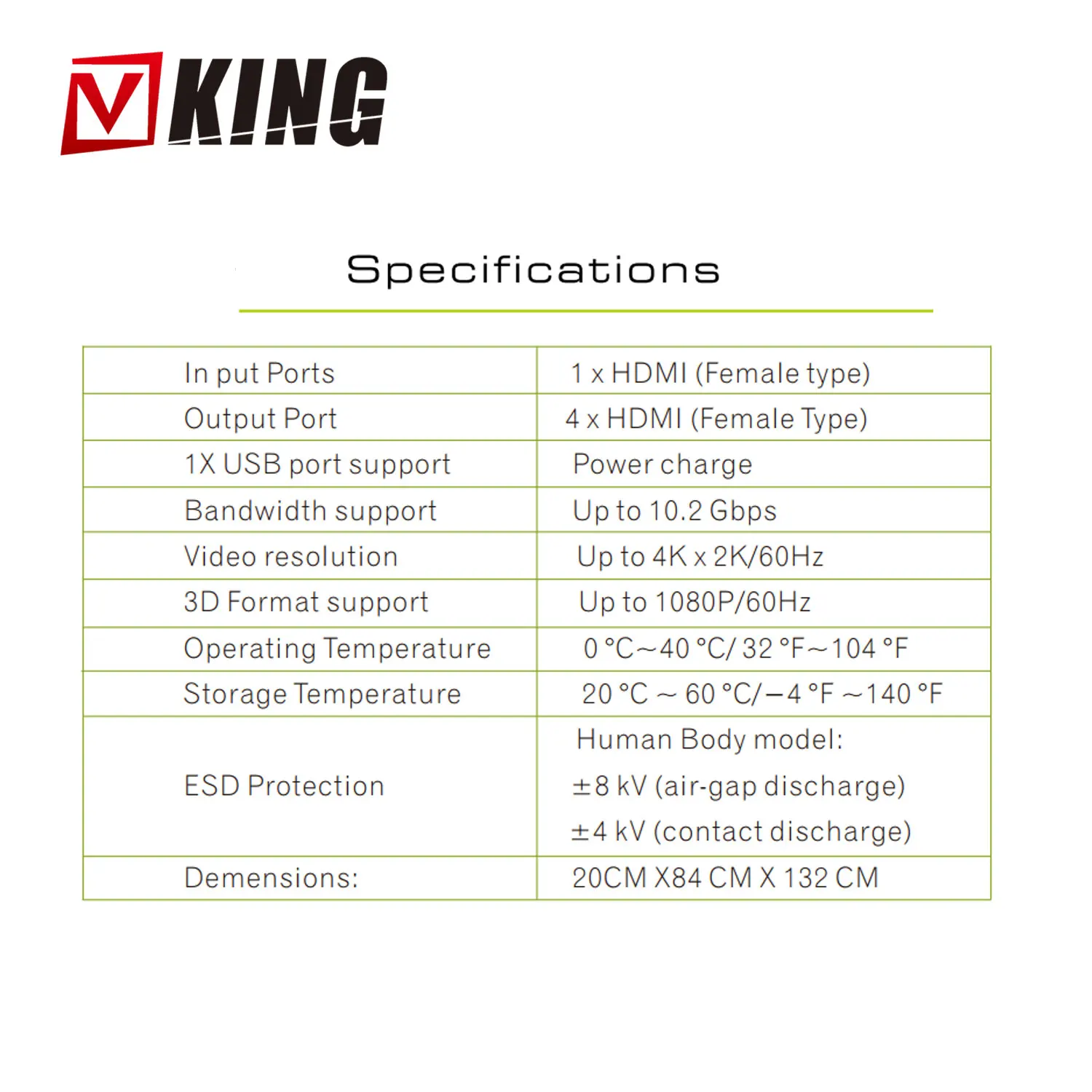 | HDMI Splitter Output Ports | 4xHDMI Female output ports |