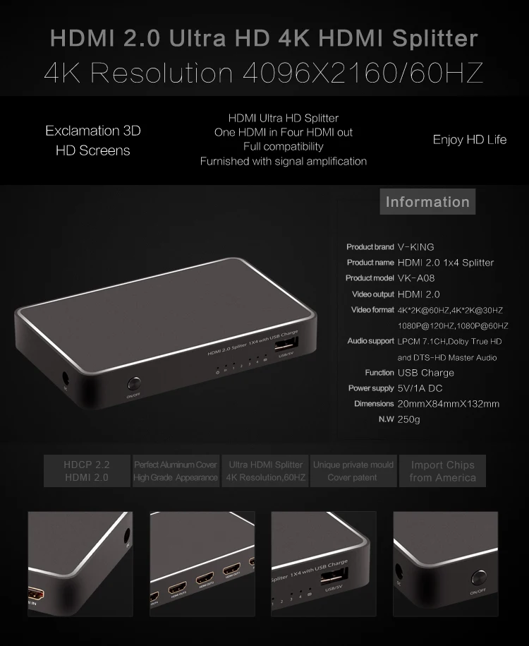 This is a high performance one HDMI input and four HDMI output splitter . it