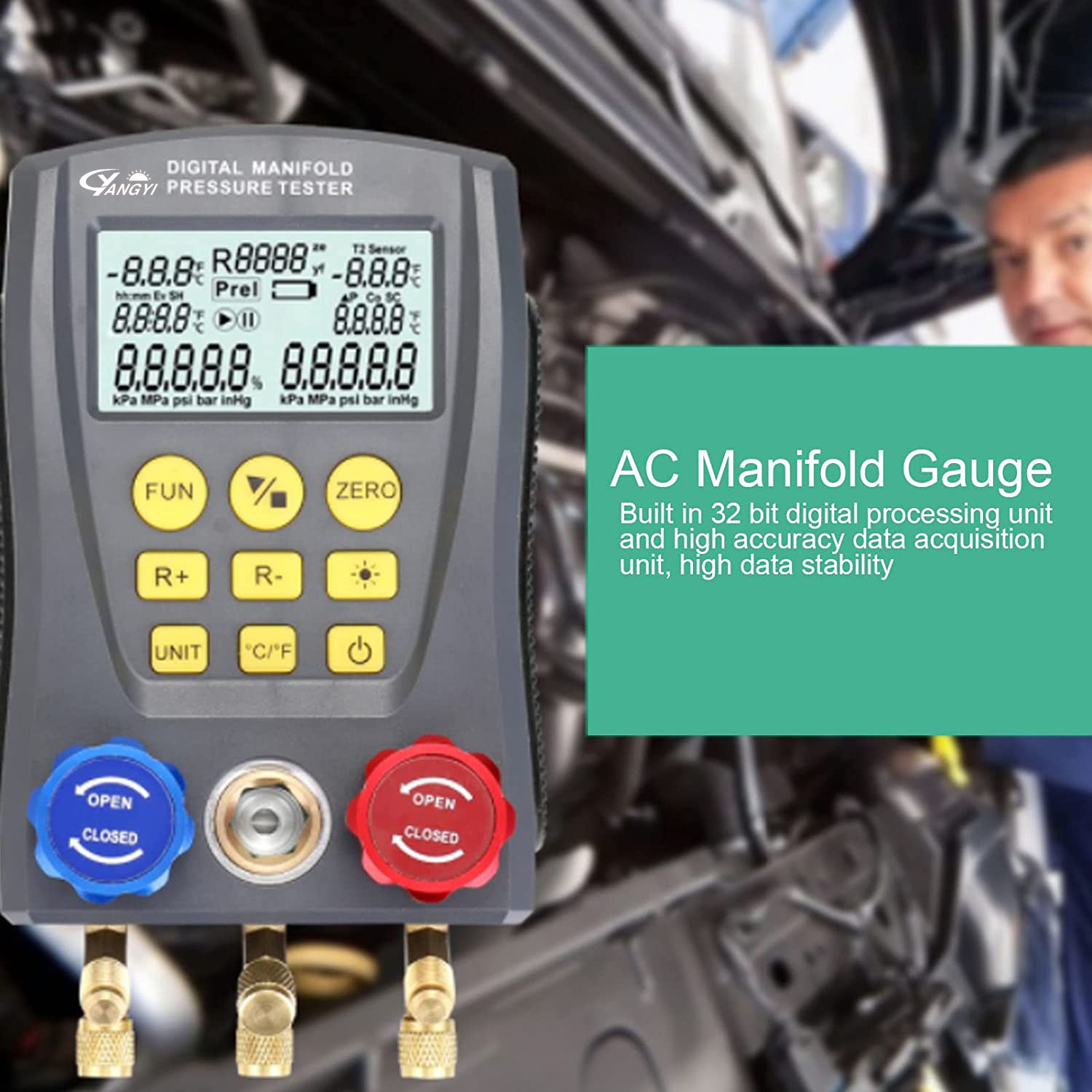 Digital Manifold Pressure Gauge with Low and High Pressure Quick Connects, Screwdriver, Copper Tank Tap, Charging Hose, Adapter and Temperature Clamp