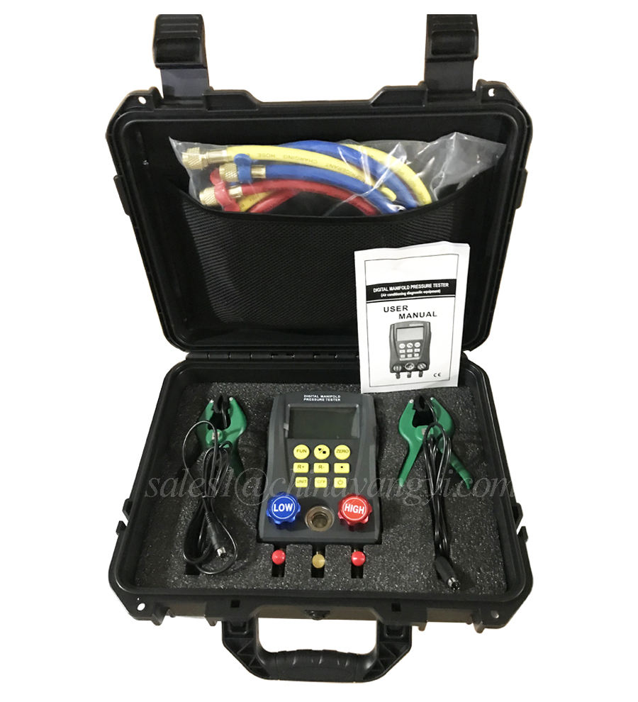 | Vacuum test device: | Kpa, Mpa, bar, inHg, PSI | Packaging Details: | 1x Refrigeration Digital Manifold Pressure Gauge 1x User Manual (English) 1x Carrying Case 2x Temperature Clamp 3x 1.5m Test Hose |