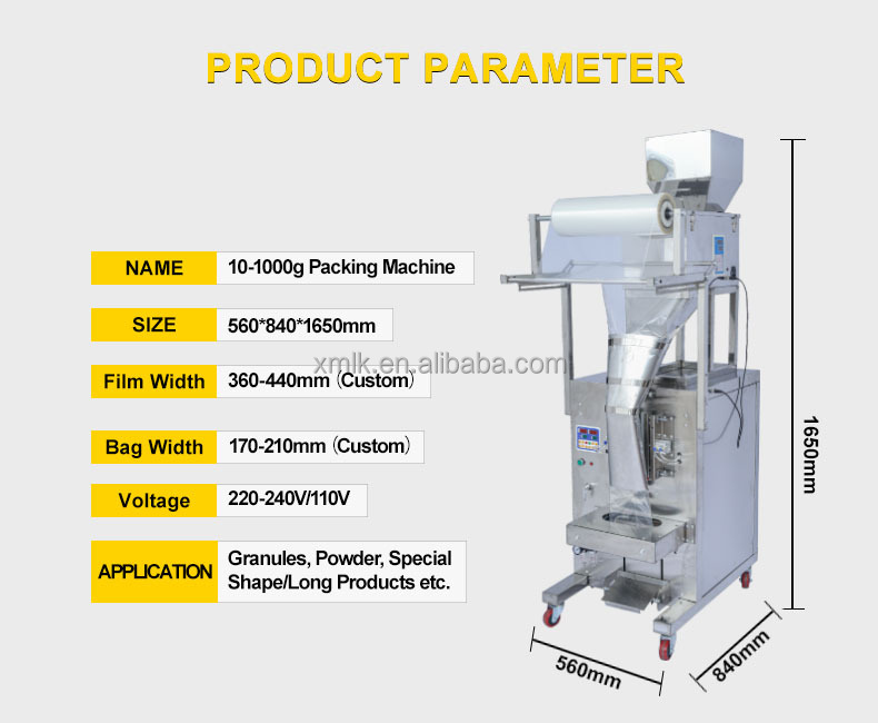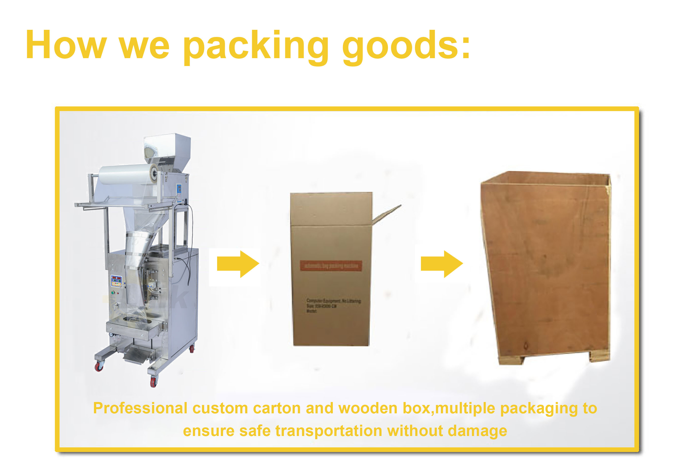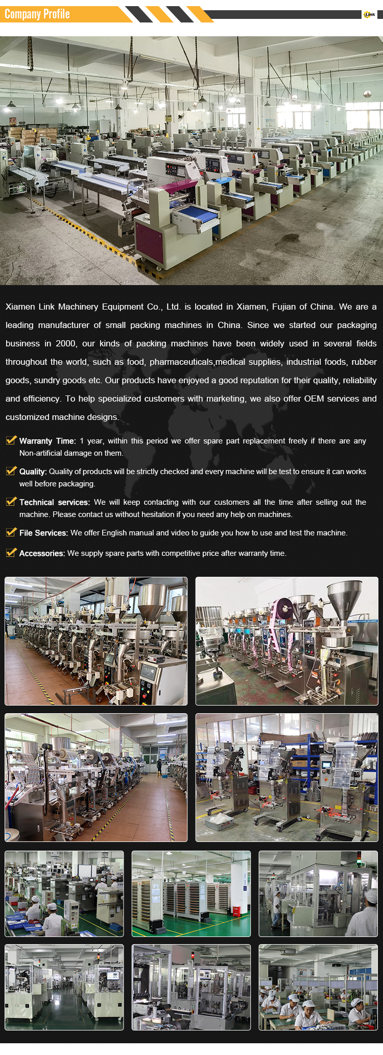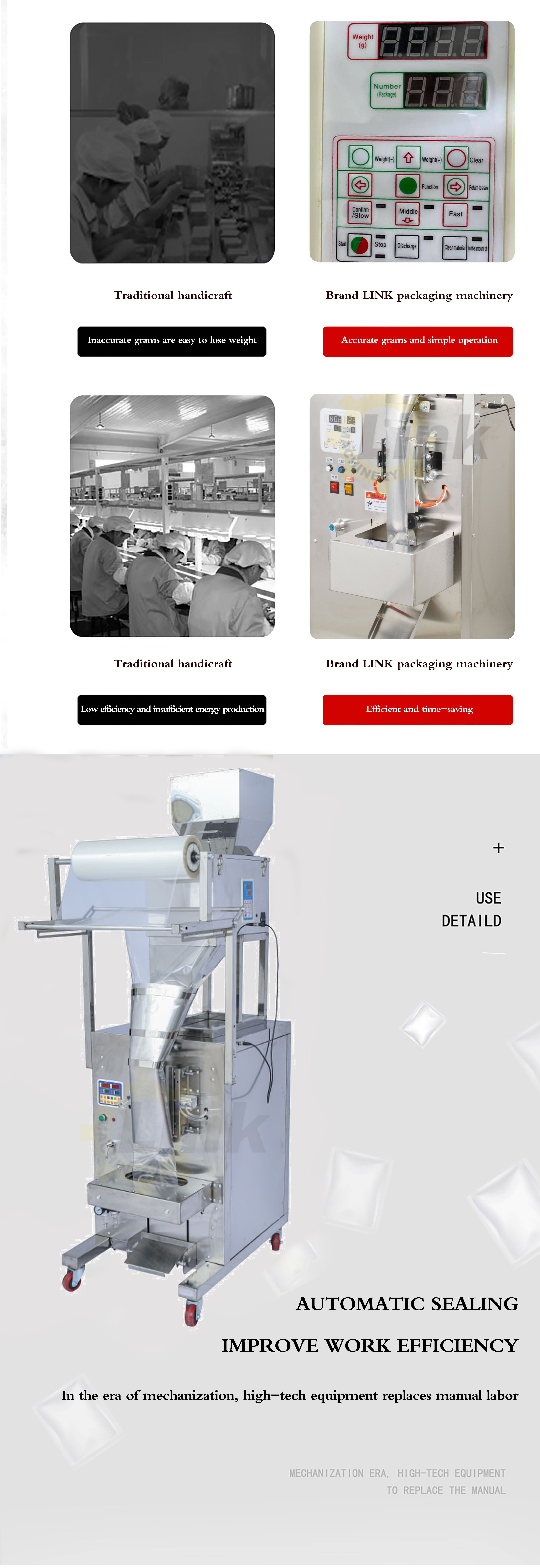 1. The design of the machine structure is reasonable and simple, and the operation of the whole machine is controlled by the computer board, which is convenient for operation and maintenance. 2. The production of this machine is stable and reliable, and the yield of finished products is high, which can improve production efficiency and benefits for users. 3. Easy to adjust: It takes about ten minutes to complete the variety replacement. 4. The important parts of the machine are all imported parts, and the external parts are made of high-precision wear-resistant oil-free bearings, which meet the hygienic standards. 5. The packing speed can reach 55 bags/min. 6. The packaging machine adopts a fully automatic detection device to realize the full automation of the packaging process, reduce the labor intensity of workers and save labor. 7. Optional functions: waterproof design: the machine adopts a fully enclosed, no dead angle waterproof design, which has a wider range of applications.