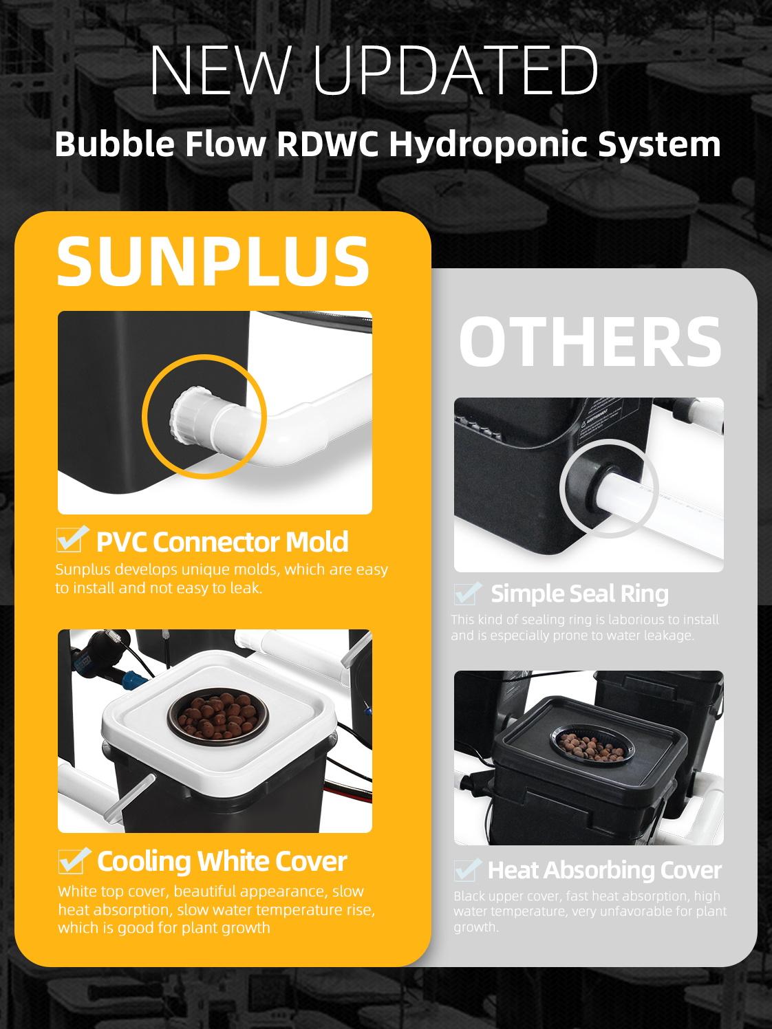 The RDWC Hydroponic System (Recirculating Deep Water Cultivation System) is an improved version of the DWC (Deep Water Cultivation) system, which allows plants to obtain unlimited nutrients. A method of plant growth that submerges the roots in a hyperoxic nutrient solution By using an RDWC system, you can optimize your plants to their maximum growth potential as the superoxygenated nutrient solution is constantly recirculated around the system via an in-line pump. The in-line pump generates an electric current that draws the nutrient solution into the basin, cools and mixes the nutrient with the water containing the bulk, and the PH and EC levels circulating in the system are maintained continuously.