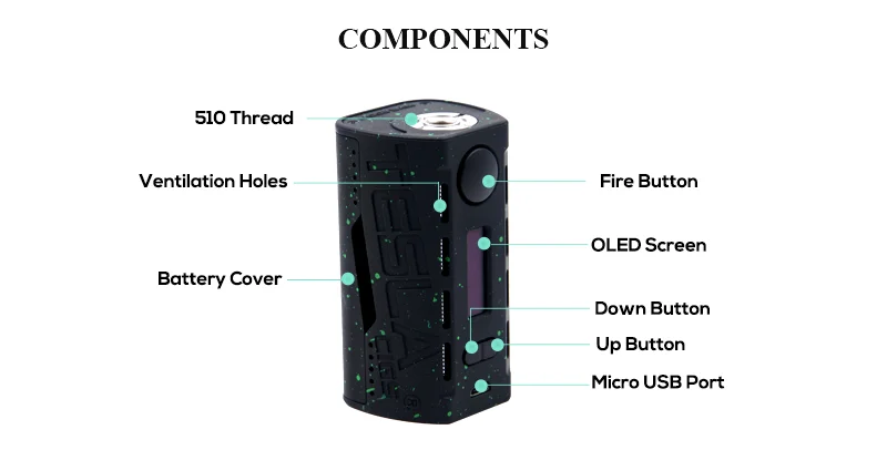 The Teslacigs WYE 200w Box Mod comes in 6 unique colors, full of youth and vitality! Product background is in pure color, and each color is splattered by another dotted color, assertive yet personalized. Aside from the colors, the fire button also continues the previous large button design, with which you can get comfortable hand-feel. What's more, the WYE is made of PC-ABS material, which features a good heat insulation, so it will not be hot after prolonged use. The WYE 200W box mod matches two 18650 external batteries and supports USB charging as well. Battery cover with magnetic adsorption design can be installed in reverse so you will get a convenient use.