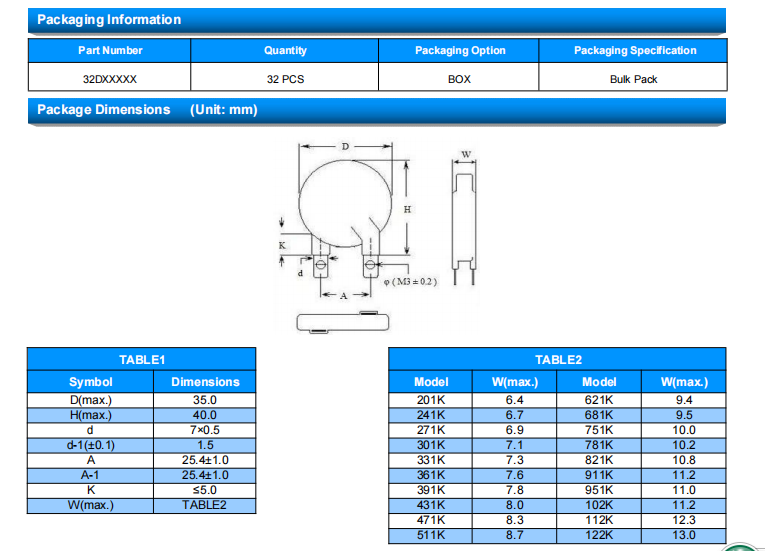 | type: | Metal Oxide Varistors (MOV) | model: | 07D101K |