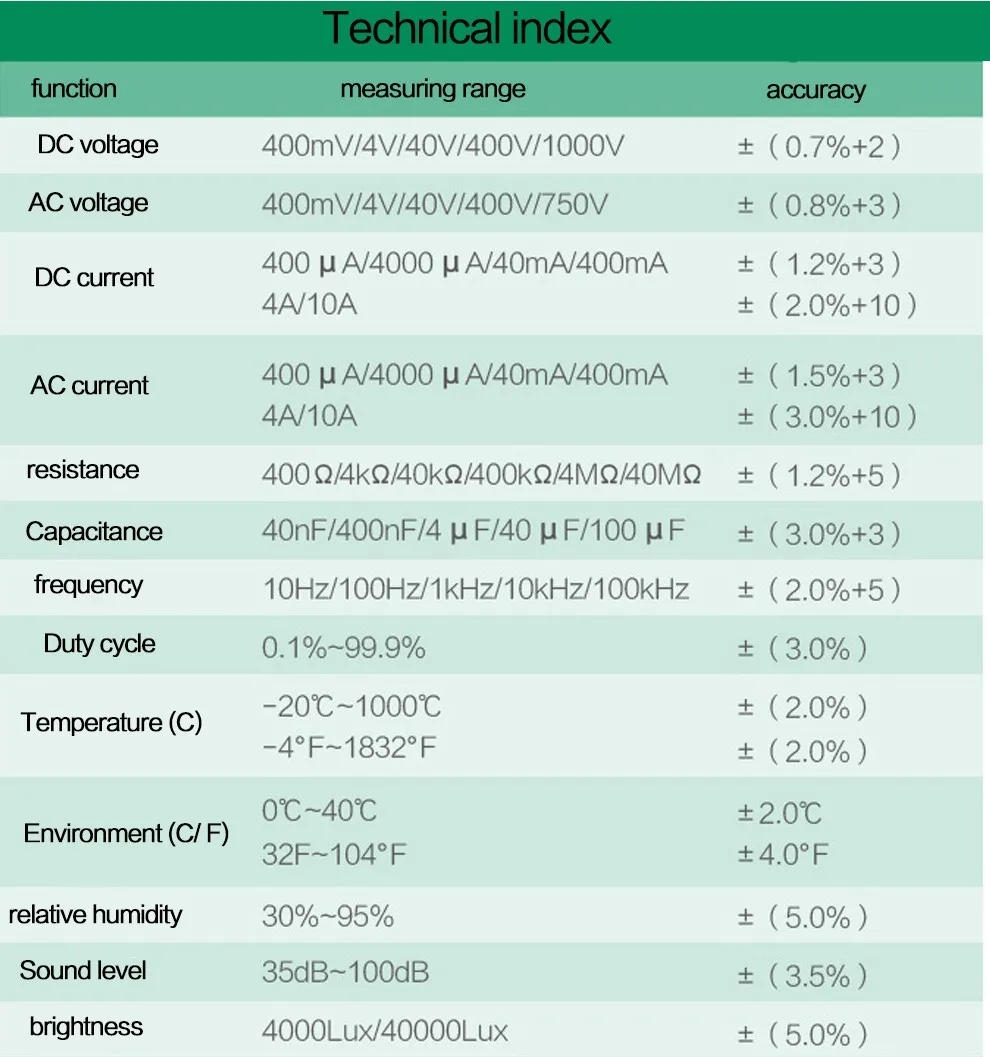 | Operating temperature: | 0-40℃ | DC current measurement: | 400uA/4000uA/40mA/400Ma/4A |