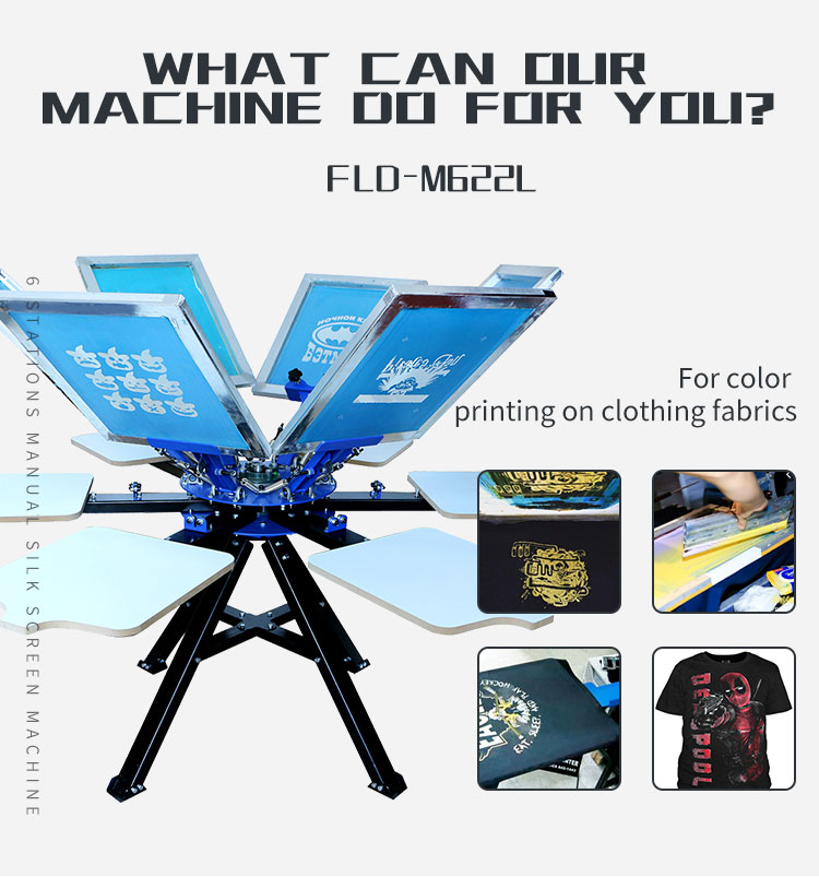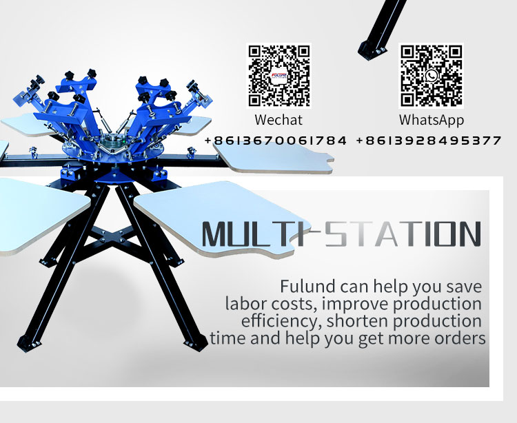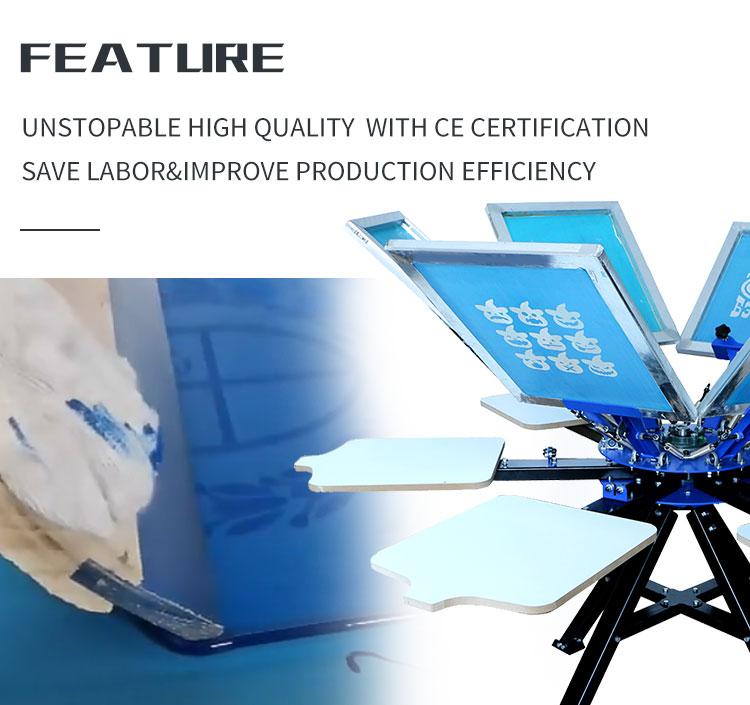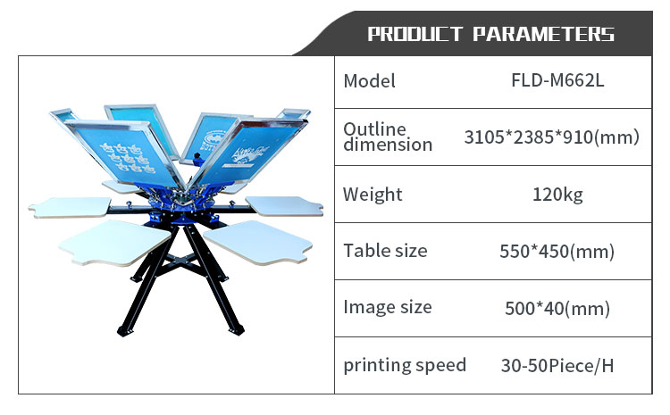 Mainly used for six-color T-shirt overprinting, equipped with four frame chucks and six T-shirt tray stations;