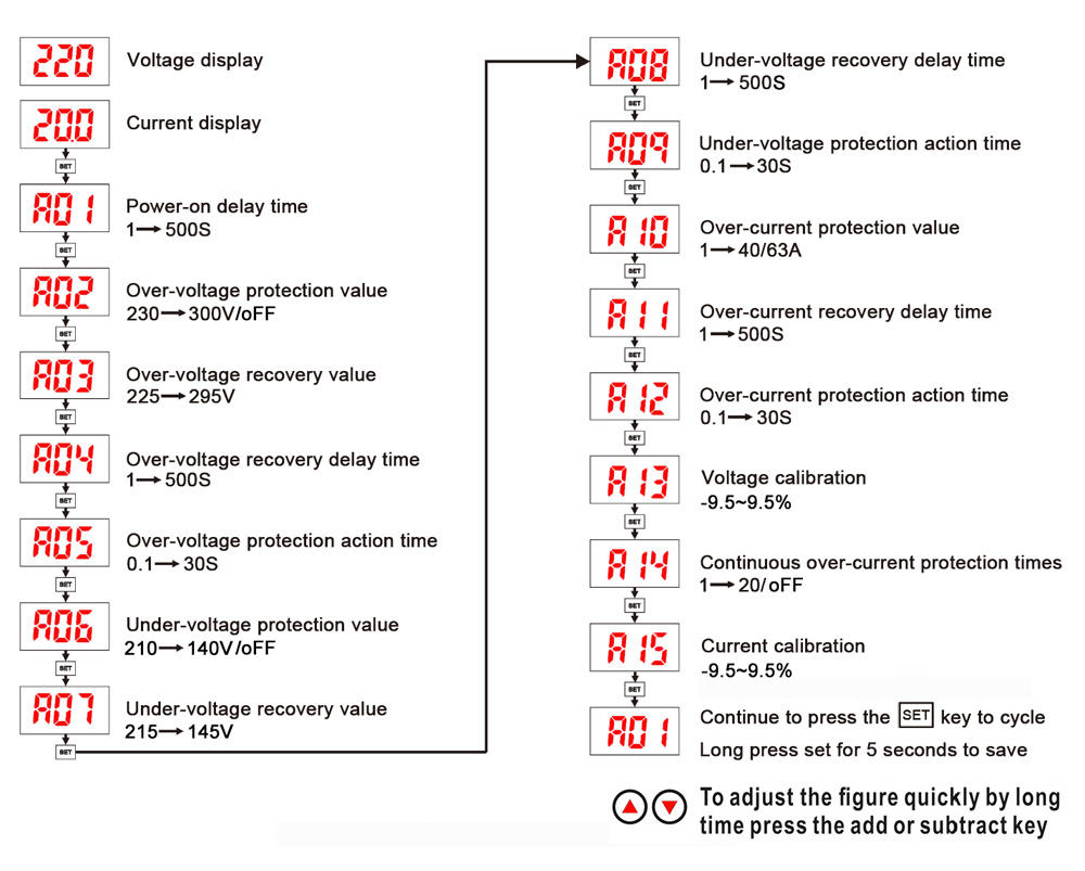 | Reset/Startup Delay: | 1~500 seconds | Current (>A) setting range: | 1-40/63A |