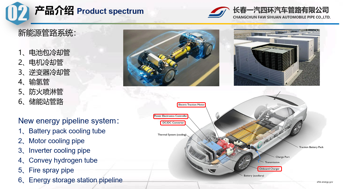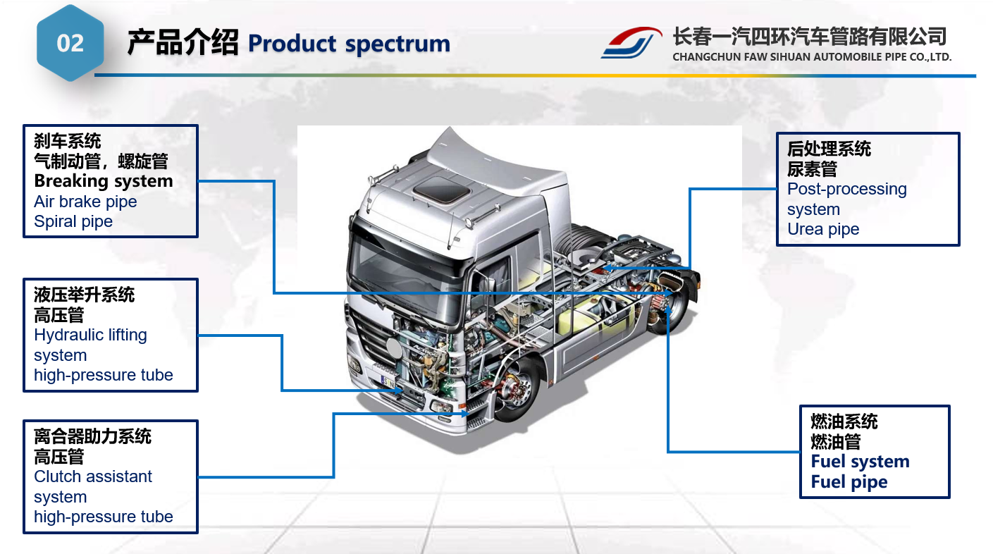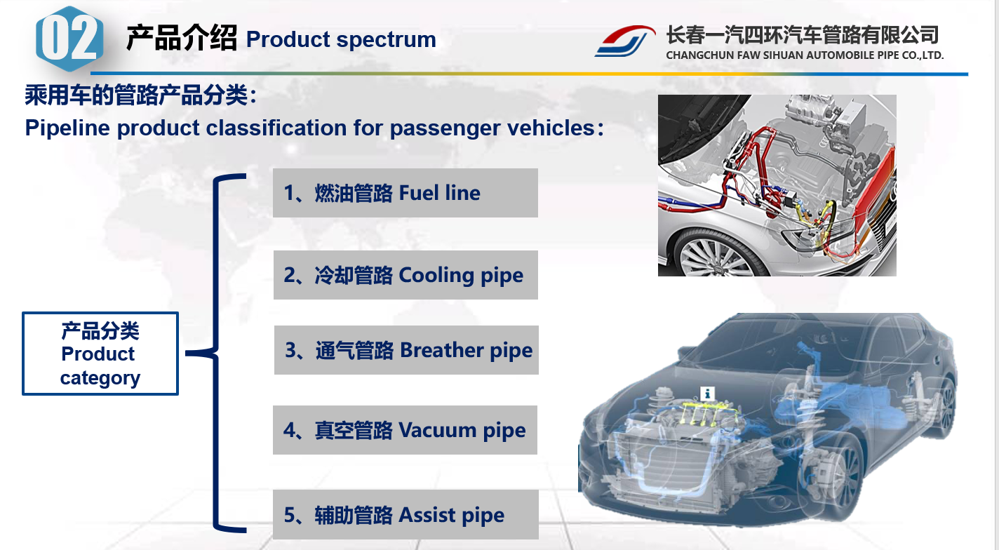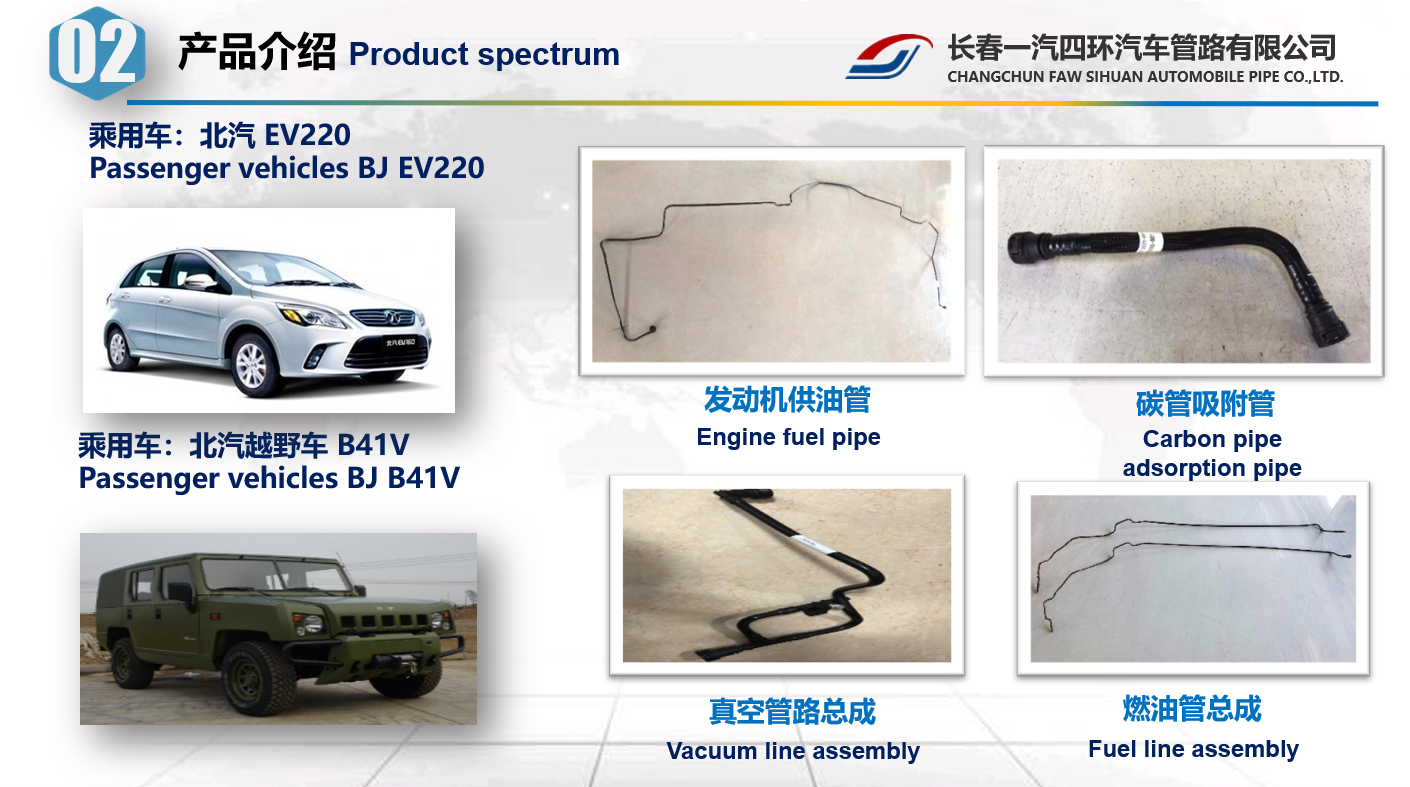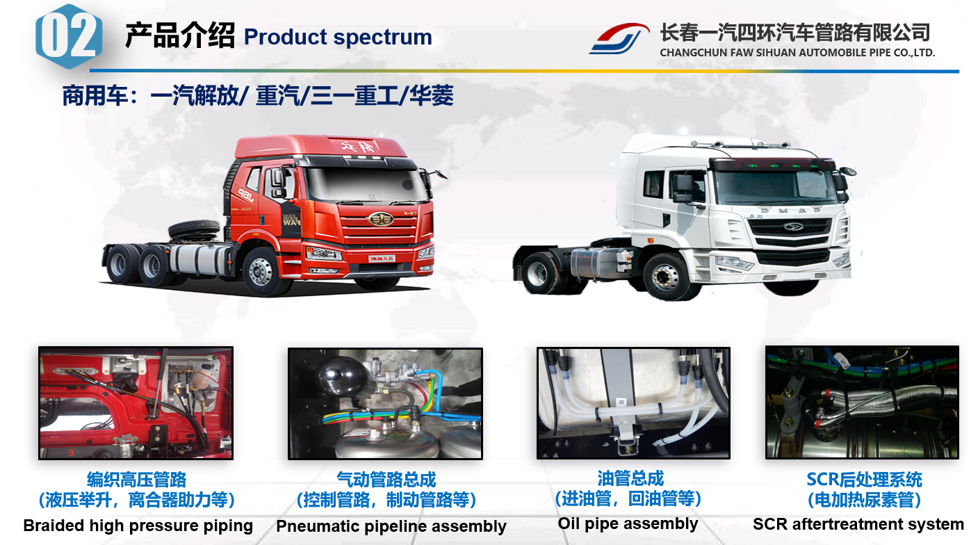 Our factory involves braking system (including vacuum brake pipe, air brake pipe, spiral pipe, rear axle brake pipe); fuel system (covering atmospheric dust filter pipe, fuel pipe, crankcase ventilation pipe, vacuum pipe); new energy The thermal system management system and the industrial energy storage water inlet and return pipeline assembly integrate safety functions such as check valves, flow regulating valves, and exhaust valves, which directly affect vehicle performance and are the prerequisite for safe driving; SCR systems (including electric heating urea pipes, cooling water pipes and gas pipes); all products have passed CQC certification, and the parameters tested by the laboratory are much higher than the national standards and industry standards. It has been supplied to FAW Jiefang, FAW Pentium and suppliers.
