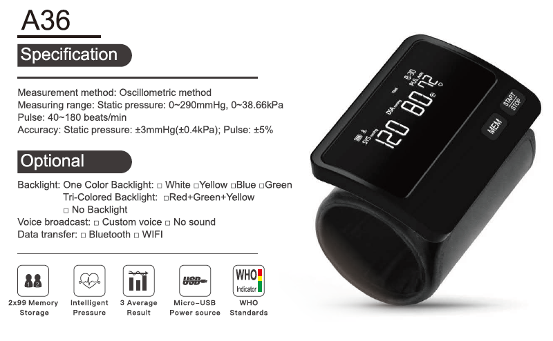 | accuracy: | Pressure +/-3mmHg; Pulse +/-5% | Function: | 2x90 banks of memory |
